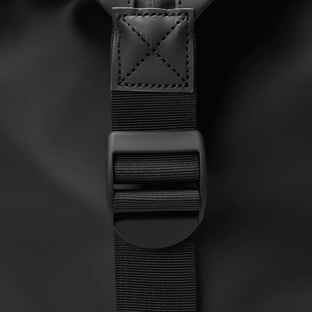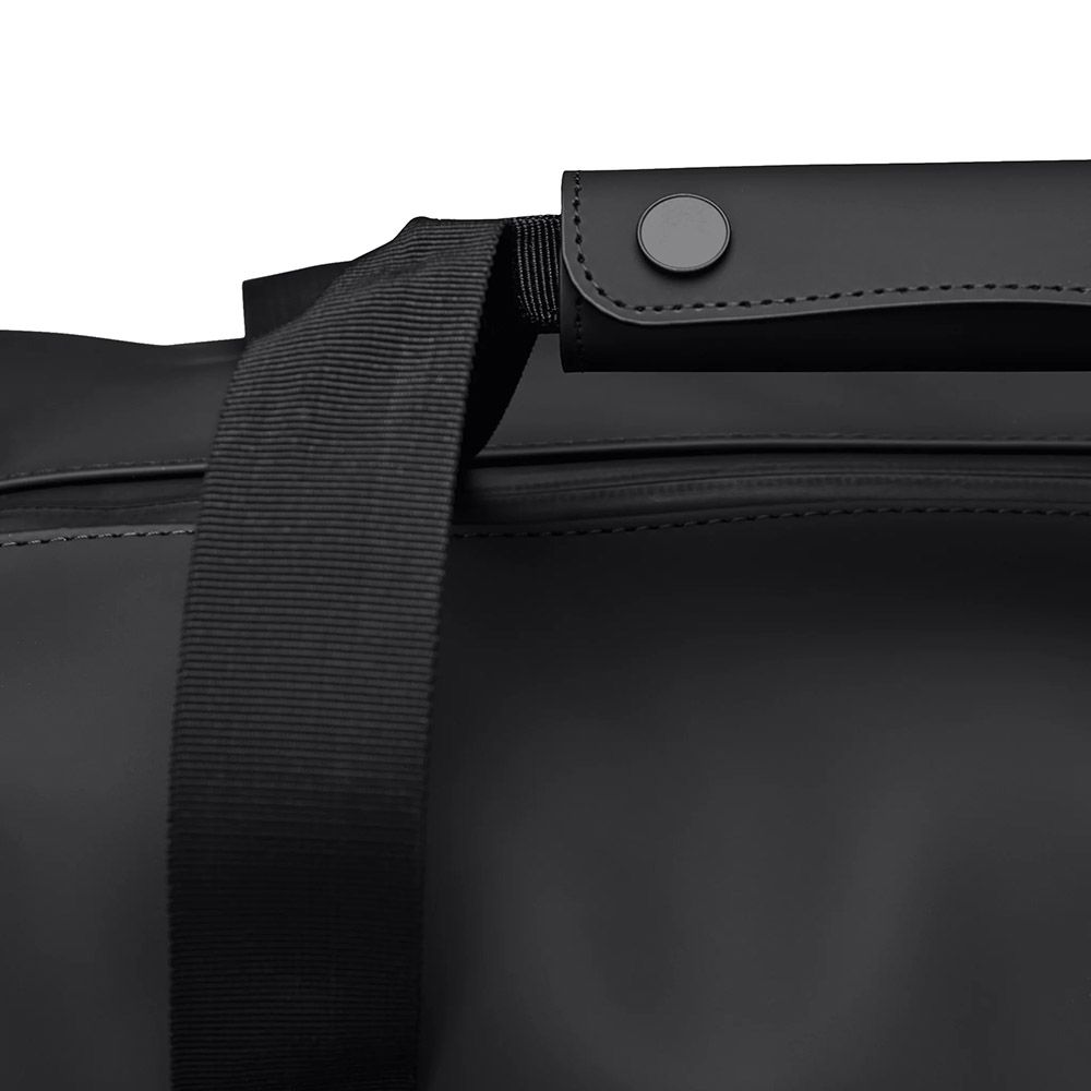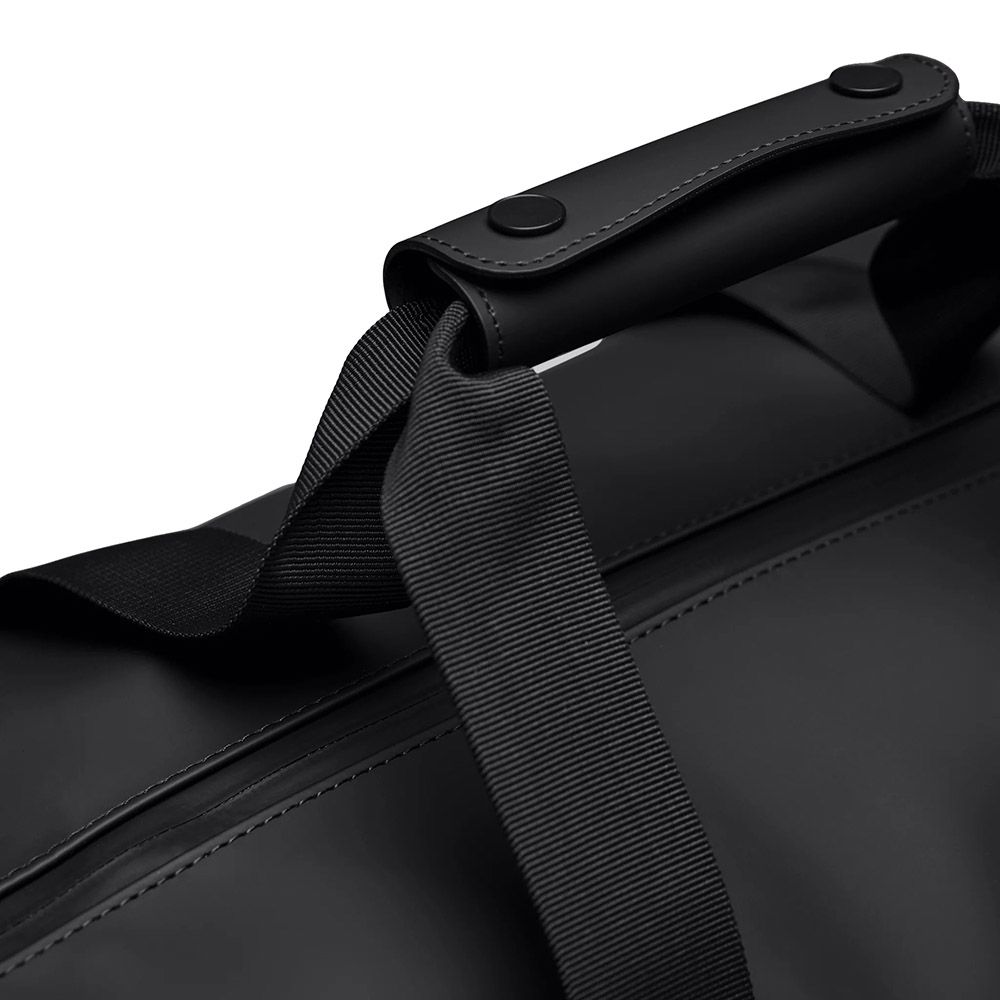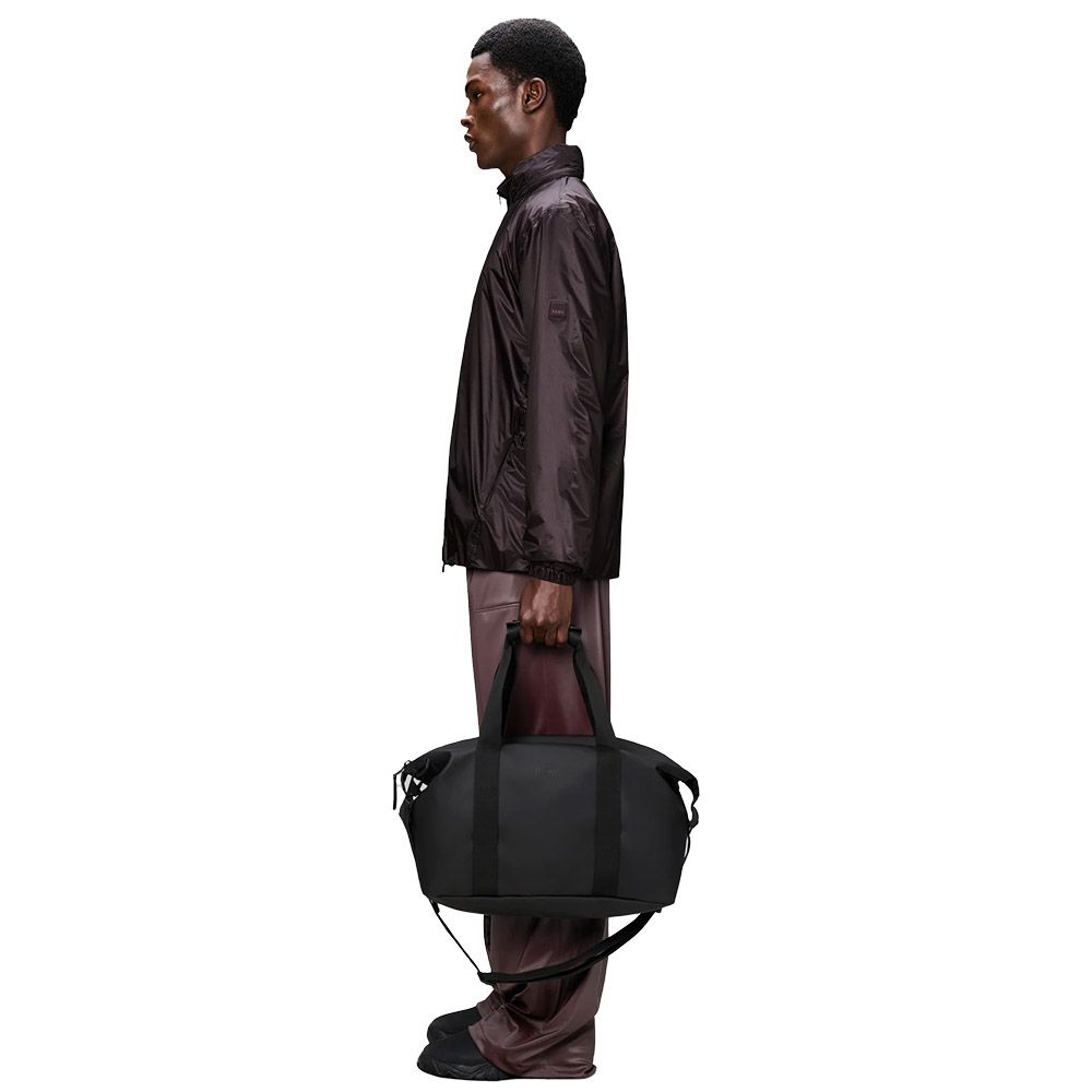 Rains Hilo Weekend Bag Small, travel duffel built in 100% polyester fabric with PU coating and brand characteristic finish. Waterproofing tested at 8000 mm water columns that guarantees elevated protection against rain and moisture. Capacity of 18 liters with compact dimensions 23 x 20 x 40 cm, the smallest of three sizes available in the Hilo line. Coated full-length zip opens on single main compartment with space for clothing and essential items for short trips. Side compression straps keep contents compact and organized. Webbing handles with wrapped grip for comfort in hold. Adjustable and detachable webbing strap with integrated attachment rings. Weight of 640 grams.