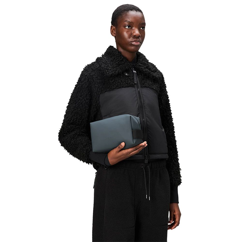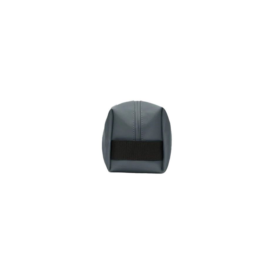 Rains Wash Bag Small, waterproof toiletry bag built in 100% polyester fabric with PU coating and leather-effect finish. Water column of 8000 mm guarantees elevated resistance against moisture and splashes. Minimalist square design with single main compartment, 3 liter capacity. Compact dimensions 13 x 11 x 21 cm suitable for travel essentials: shower, shaving, cosmetics. Coated tone-on-tone zip closure. Webbing handle for carrying. Weight 160 grams.
