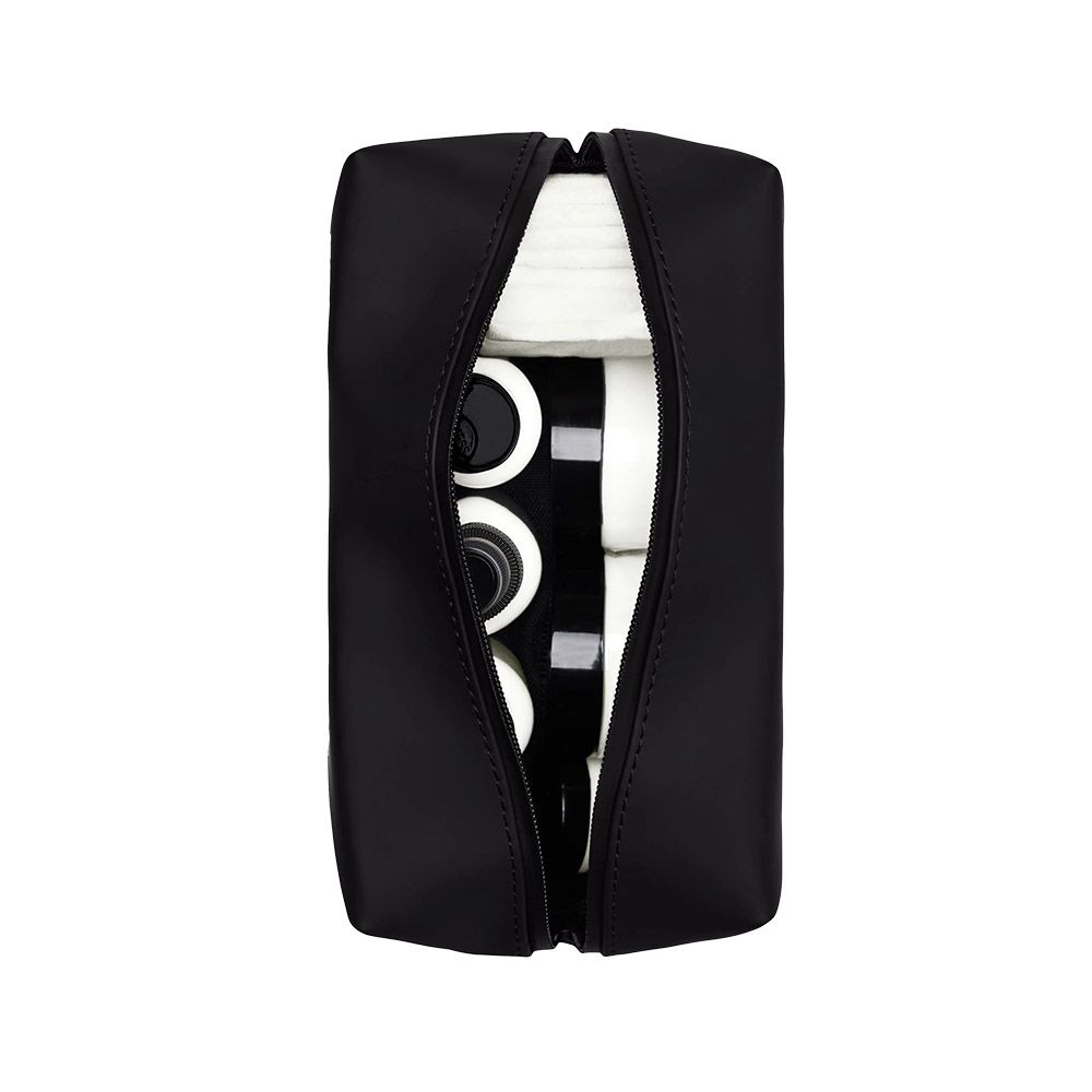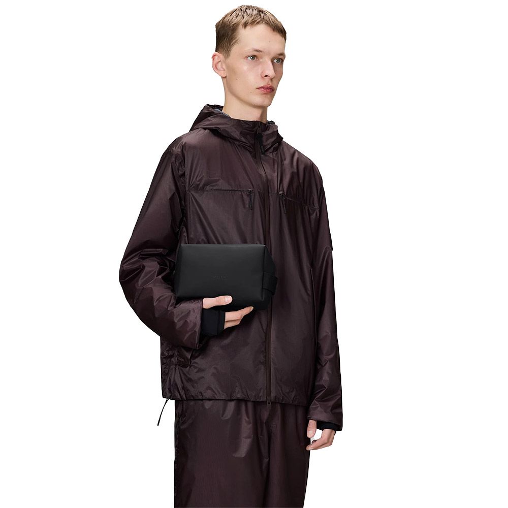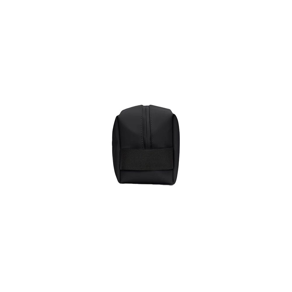Rains Wash Bag Small, waterproof cosmetic pouch made in 100% polyester with PU coating and leather-effect finish. Certified waterproofing with 8000 mm water column that protects contents from water and moisture. Essential square shape with single internal compartment, total volume 3 liters. Compact measurements 13 x 11 x 21 cm ideal for travel bathroom essentials: shower products, shaving and cosmetics. Matching coated zip closure. Webbing grab handle. Total weight 160 grams.
