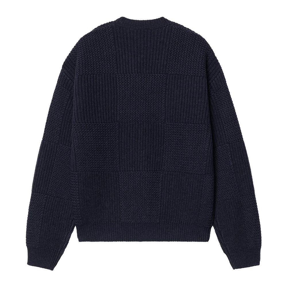 Carhartt WIP Bishop Sweater, sweater built in heavy yarn with composition 70% wool, 25% polyamide and 5% other fibers. The blend integrates natural warmth and texture of wool with structural resistance of polyamide that maintains shape and reduces wear. Tone-on-tone check pattern worked directly into fabric creates discreet pattern through texture variations rather than sharp color contrasts. The heavy yarn offers robust consistency and elevated thermal insulation. Carhartt WIP square label applied on bottom hem.