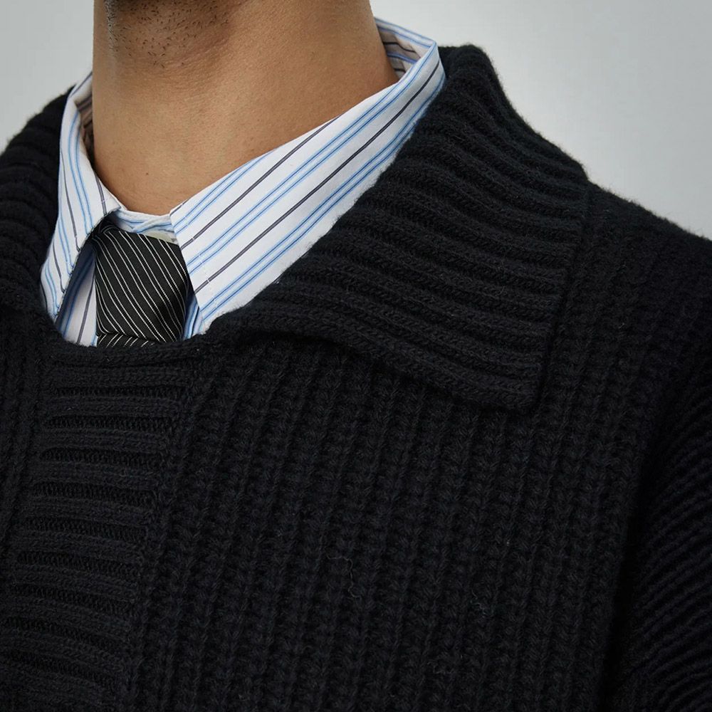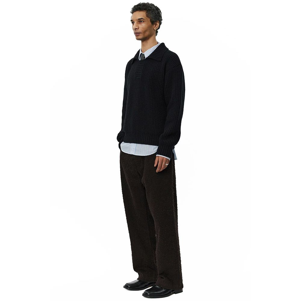 mfpen Collar Sweater, sweater built in 100% wool with Italian yarn worked in Portugal. The open structure of natural yarn eliminates synthetic stabilizing fibers used in standard industrial production: the garment progressively adapts to the body with wear, expanding and shaping the fit over time. 2x2 rib knit throughout the body, 4x4 rib on collar, hem and cuffs for greater consistency. Open shirt collar with faux placket. Regular fit with pronounced drop shoulder. Store folded to maintain original shape. Dry clean only.
