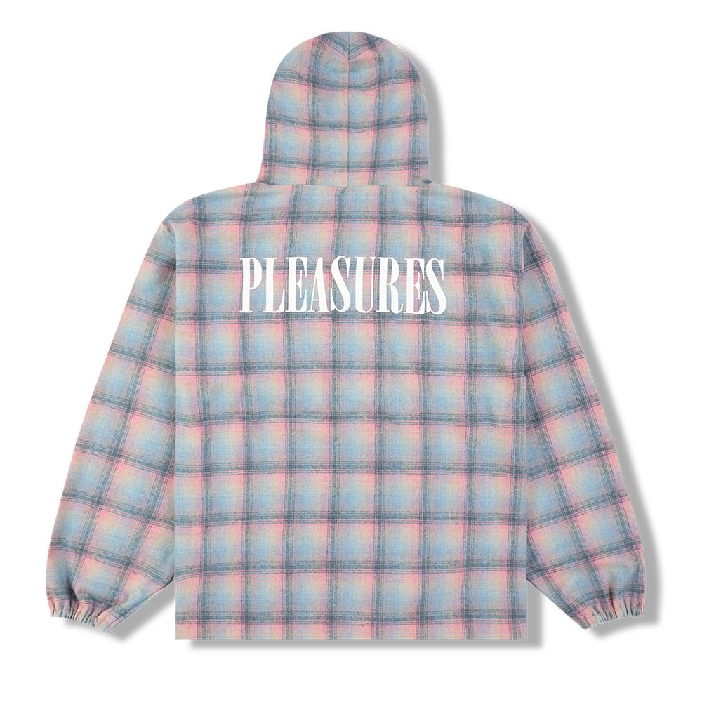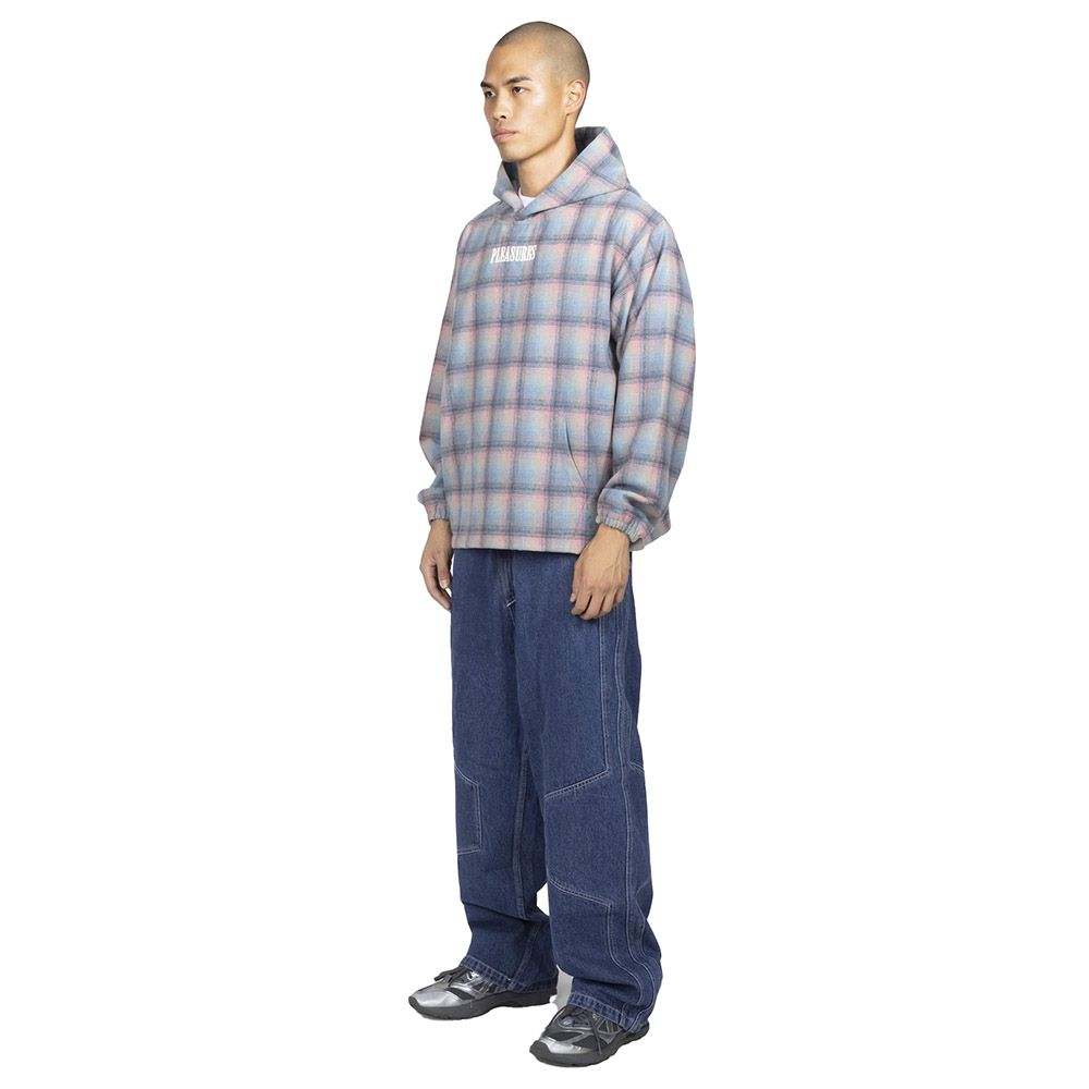 Pleasures Sender Poncho Hoodie, traditional poncho reworked in urban style with hood, embroidered logos and adjustable drawstring. Made in 100% wool flannel with checks -- natural fiber that insulates and retains body heat. The fabric offers softness to the touch and durability over time. Wide shape with dropped shoulders and balloon sleeves that close with elastic cuffs. Pleasures logos embroidered on front and back. Front pouch pocket. The waist drawstring cinches the fit when needed, creating a shorter cut. The construction ensures freedom of movement and volume for layering over hoodies or heavy shirts. Statement piece for outfits with attitude. Wool poncho hoodie.