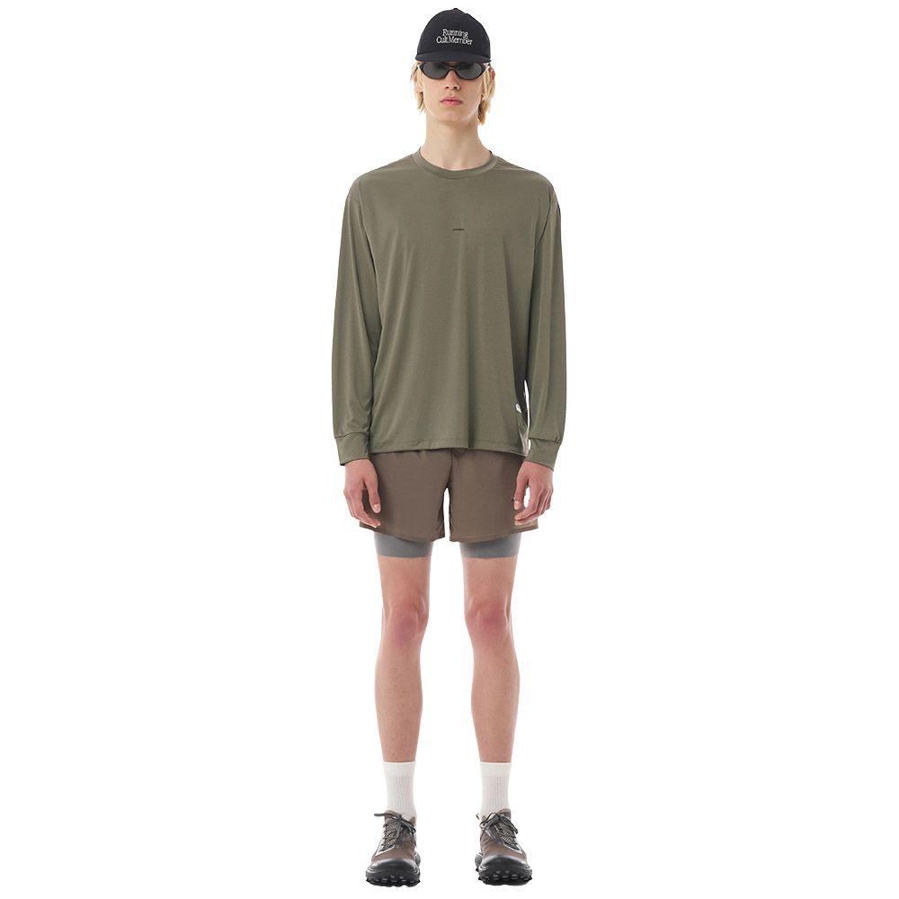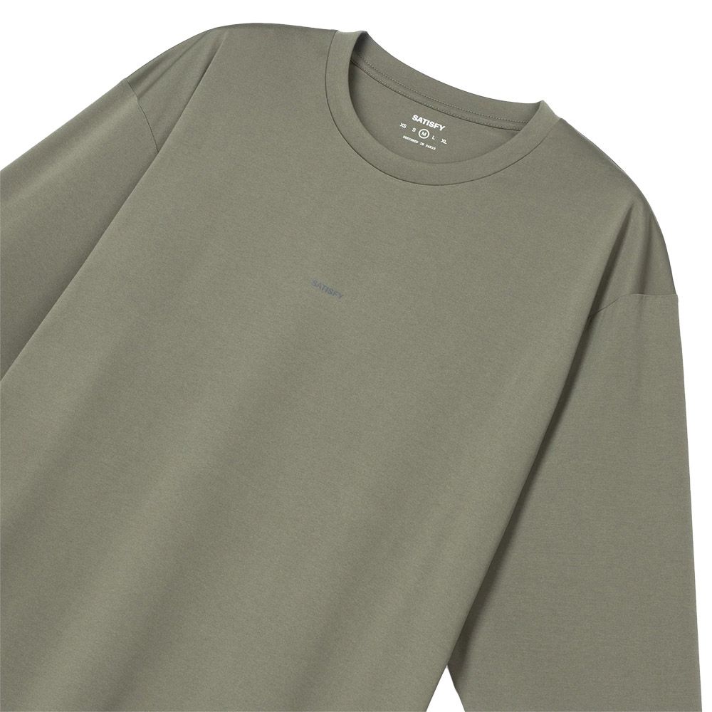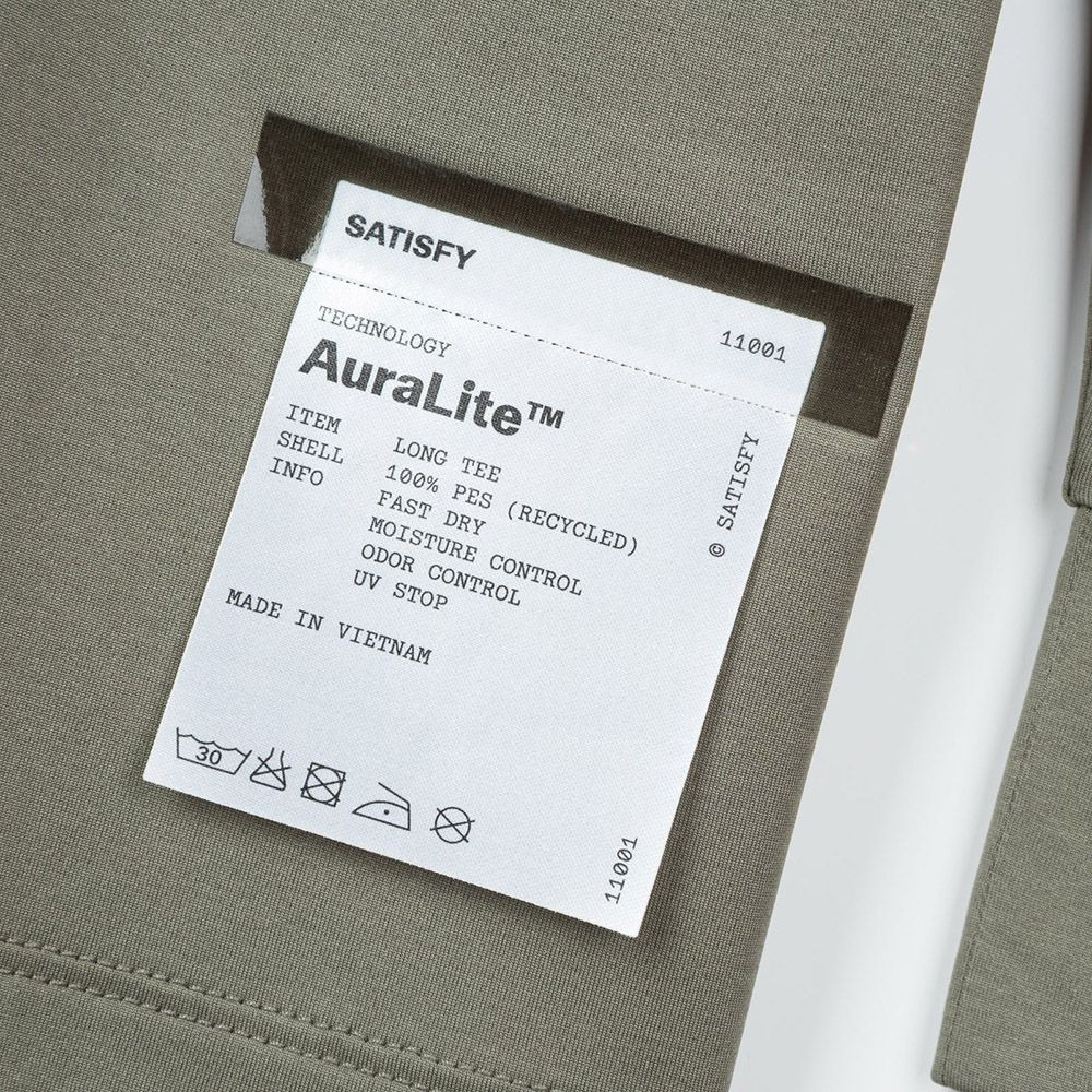 Satisfy AuraLite™ Long Tee, long sleeve tee made with recycled AuraLite™ fabric from Japan. The 100% recycled polyester offers extreme lightness and soft hand feel, with anti-wrinkle properties and snag resistance. UV treatment protects from sun rays while the fabric structure ensures optimal moisture management during activity. The long sleeve cut provides additional protection without compromising breathability. The exterior detachable care label prevents irritation. Reflective Satisfy logo and discreet print for night visibility.