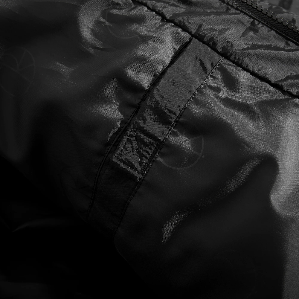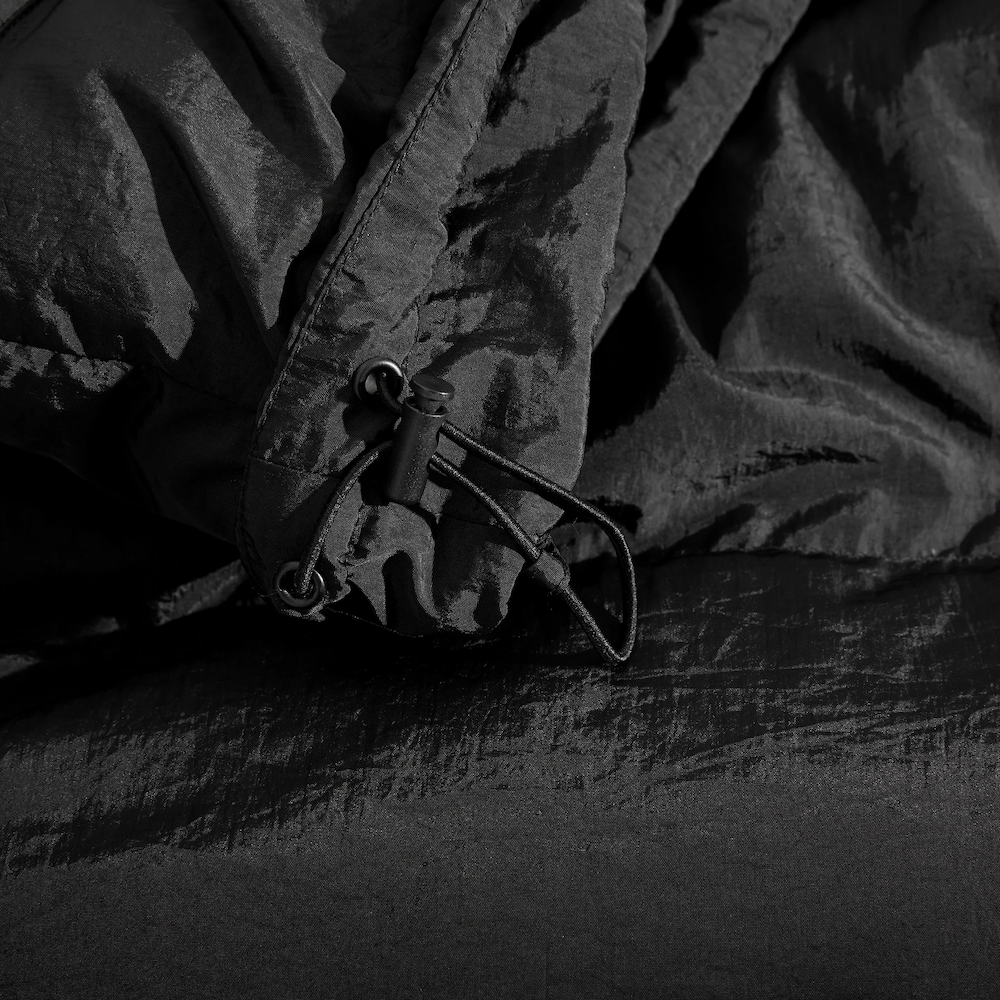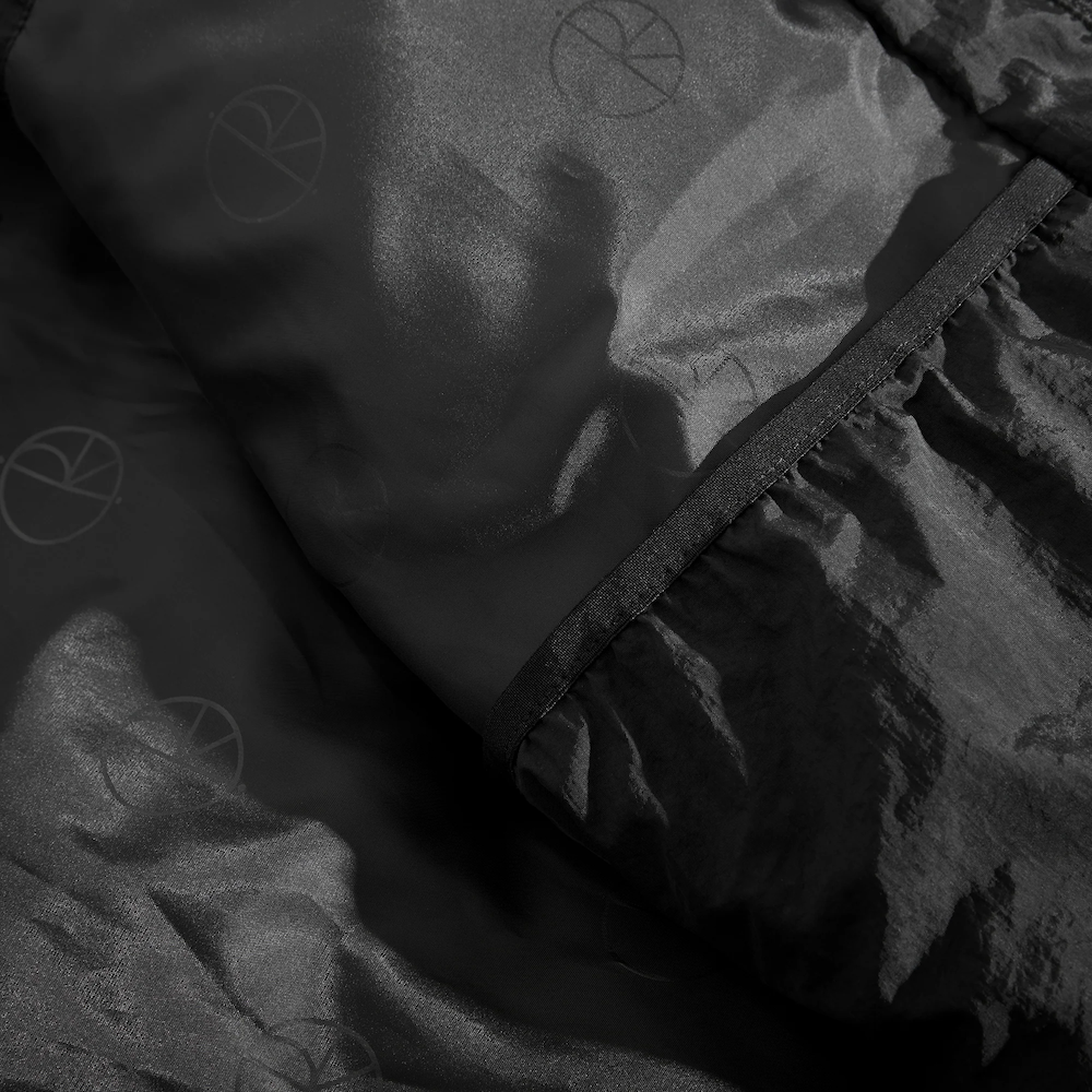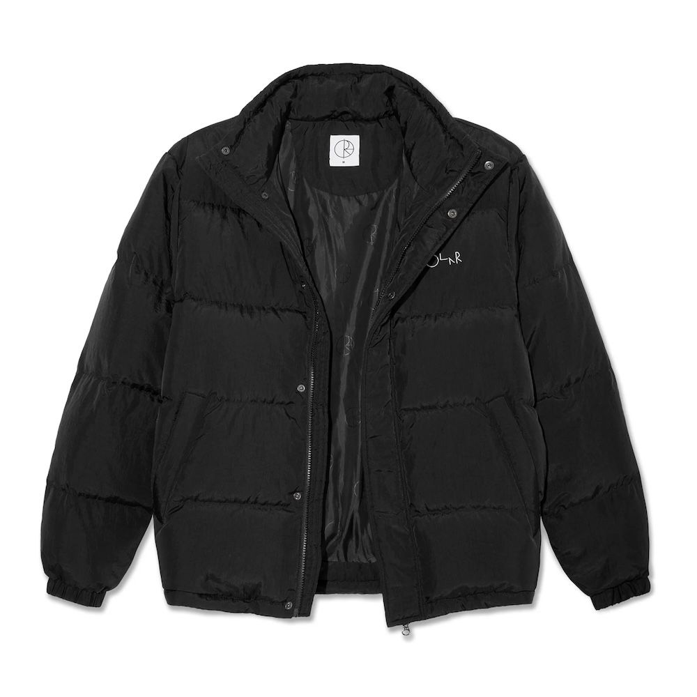 Polar Skate Co. Basic Puffer in Black, puffer jacket in crinkled Taslan nylon with regular fit and 90% down, 10% feathers padding with 600 fill power. The fabric features 1000mm PU coating for water protection. Two-way YKK zip with customized pullers for rapid ventilation. Fleece-lined pockets for hand warmth and polyester lining with printed logo. Elastic adjusters at neck and hem allow custom fit. Silver script embroidery completes brand details. The crinkled Taslan nylon offers characteristic texture and durability. Down padding ensures optimal warmth-to-weight ratio for urban winter use. The two-way zip allows movement without fully opening garment.