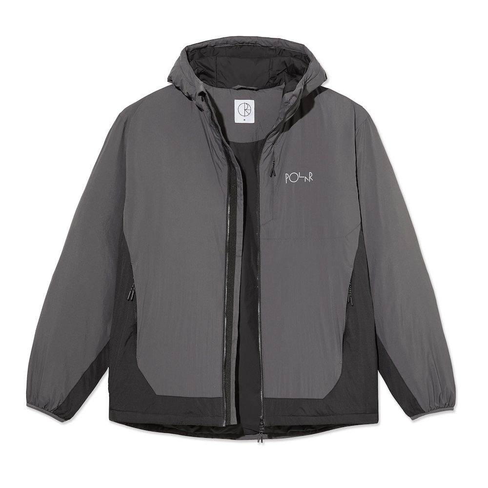 Polar Skate Co. Koda Insulated Jacket in Graphite, insulated jacket in ripstop nylon with regular fit and PrimaLoft padding. PrimaLoft is high-performance synthetic insulation that maintains warmth even when wet and compresses easily for transport. The ripstop fabric offers tear resistance with minimal weight. Closure with silver YKK metal button for durability. Script logo embroidery completes brand details. Synthetic PrimaLoft padding ensures optimal warmth-to-weight ratio and quick drying compared to down. The ripstop nylon balances lightness and durability for intensive urban use. The regular fit allows layering underneath without limiting movement.