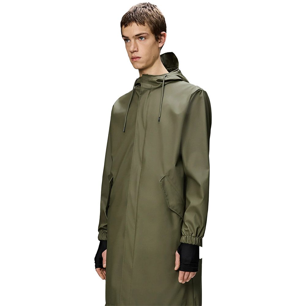Rains Fishtail Parka, unisex waterproof coat with parka length and adjustable fishtail hem. Made in the brand's iconic PU fabric, it offers waterproof protection with 5000 mm water column and welded seams. The integrated hood with peak and drawcord adapts to weather conditions, while the closure combines covered zipper and placket with hidden snaps. Two front utility pockets, elasticated cuffs and ventilated back yoke complete the functional construction. The casual cut with elegant drape and elbow darts ensures freedom of movement for daily urban use.