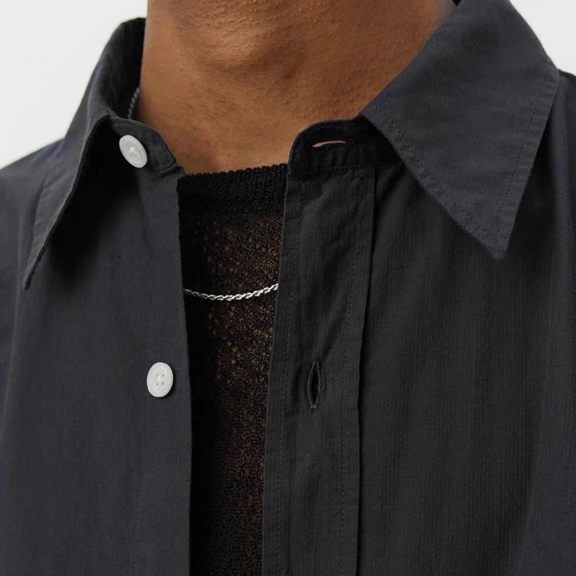 mfpen Network Shirt in Graphite Micro Structure, oversized shirt in lightweight cotton with dropped shoulders and rounded hem. The fabric features micro structure tone on tone with dark grey mini stripes for subtle texture. Smooth and soft hand feel thanks to garment washed treatment. Front button placket and back pleats for freedom of movement. Raw edge labels at end of side seams in same fabric for discreet detail. Ivory resin buttons and Portuguese construction with attention to details. The oversized fit with dropped shoulders creates relaxed silhouette. The lightweight cotton makes it versatile for layering or single use in transitional seasons.