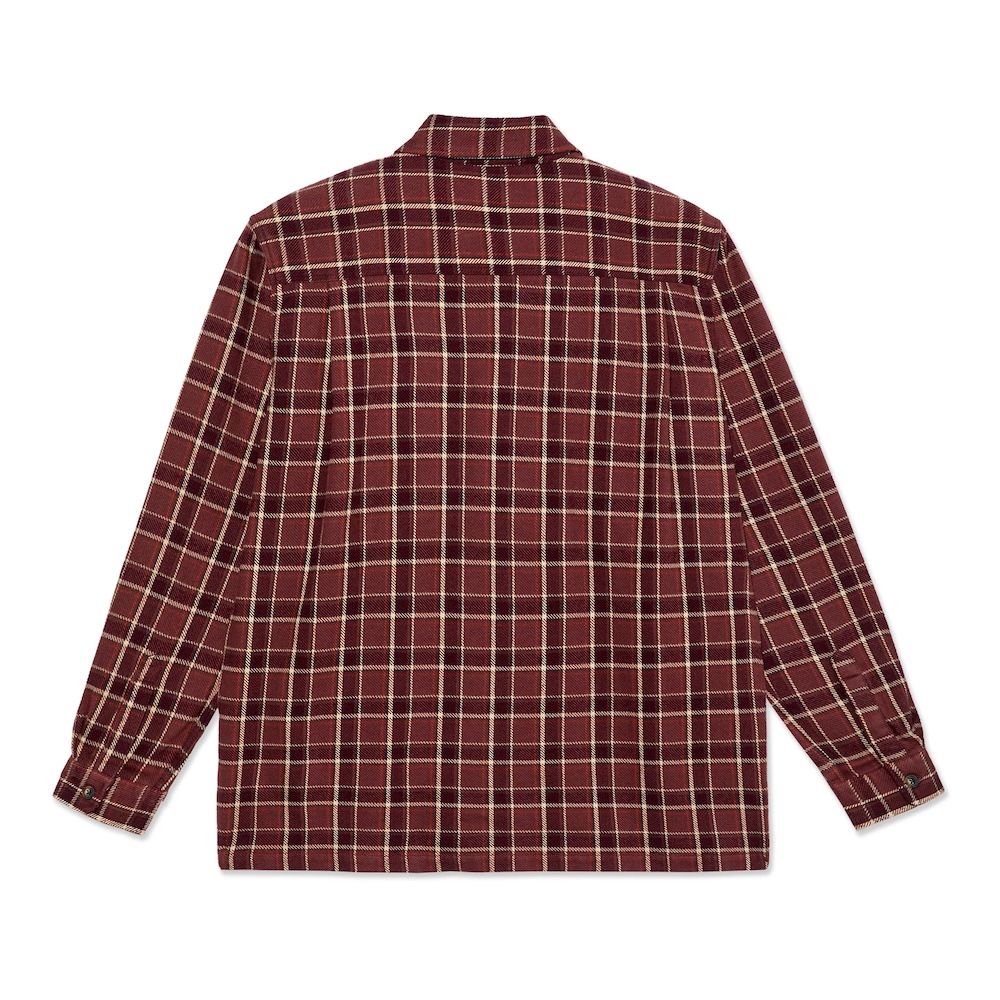 Polar Skate Co. Mike LS Flannel Shirt in Oxblood Check, long-sleeve shirt in 100% brushed cotton flannel with 270 GSM weight. Oxblood and beige check pattern. Two chest pockets with flap and Polar logo stitched on left pocket. Brushed flannel has soft surface and holds heat well. The heavy weight makes the fabric substantial and durable. Regular cut allows freedom of movement.