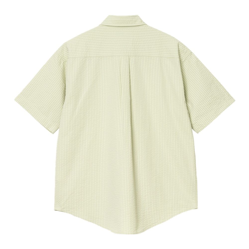 Carhartt WIP S/S Toland Shirt, short-sleeve shirt made from lightweight textured cotton seersucker with fine allover stripes. Designed with a relaxed loose fit and yarn-dyed fabric for a breathable and summery feel. Chest pocket with woven square label completes the look.