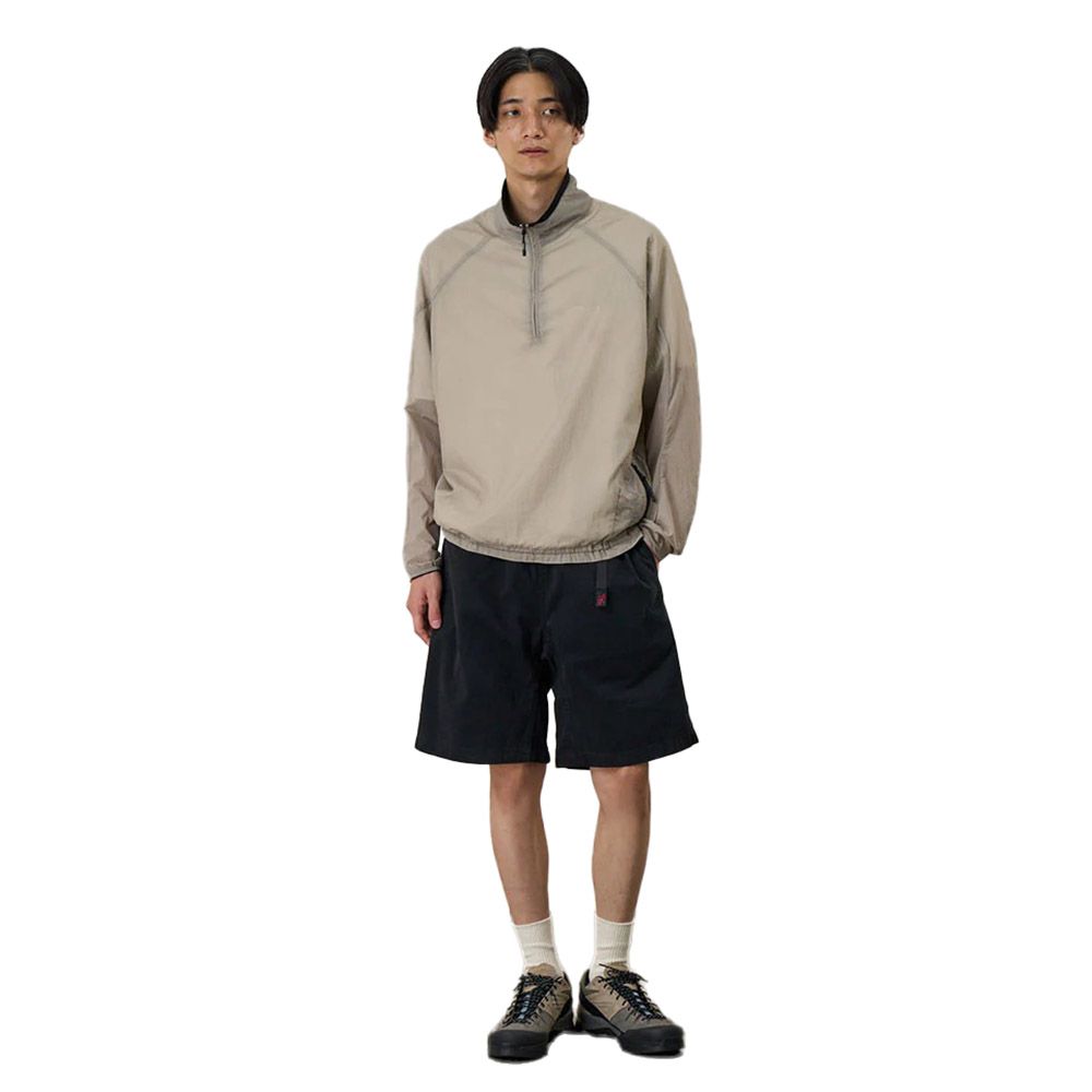 Gramicci G-Short, shorts in organic cotton twill with Flex Fit elastic waistband and integrated nylon cinch belt. Gusseted crotch for ease of movement. Deep-reach front pockets and Velcro-tabbed rear pocket. Reinforced lock stitching. Colour: Black.