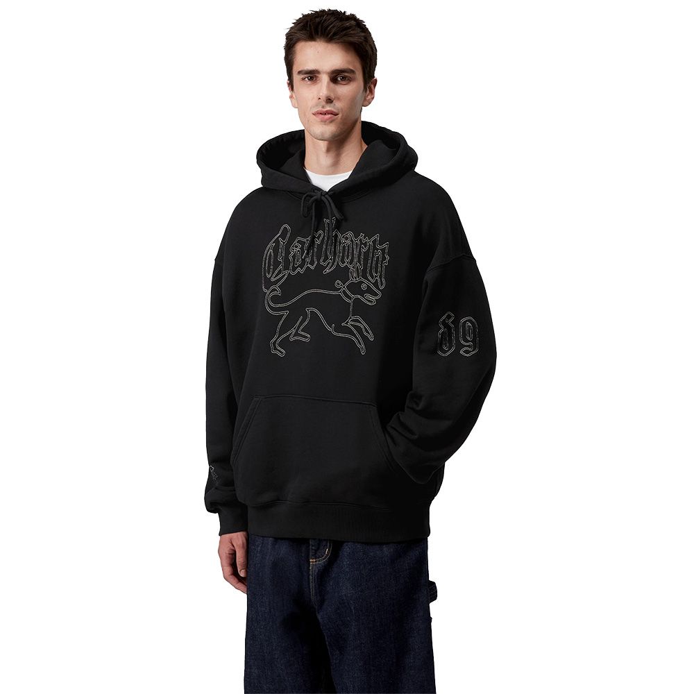 Carhartt WIP Hooded Hackwork Sweatshirt, hooded sweatshirt in heavyweight garment-washed cotton jersey with balloon fit. The roomier, boxier cut features dropped shoulders and ribbed trims for relaxed comfort. The garment-wash treatment provides lived-in appearance and immediate softness to fabric. Adjustable hood and front kangaroo pocket complete practicality while graphic embroidery distributed across garment adds distinctive details. The balloon fit offers generous space while maintaining balanced proportions. Robust cotton construction that improves with use and washes. For those seeking a sweatshirt that doesn't follow body lines but has its own presence.