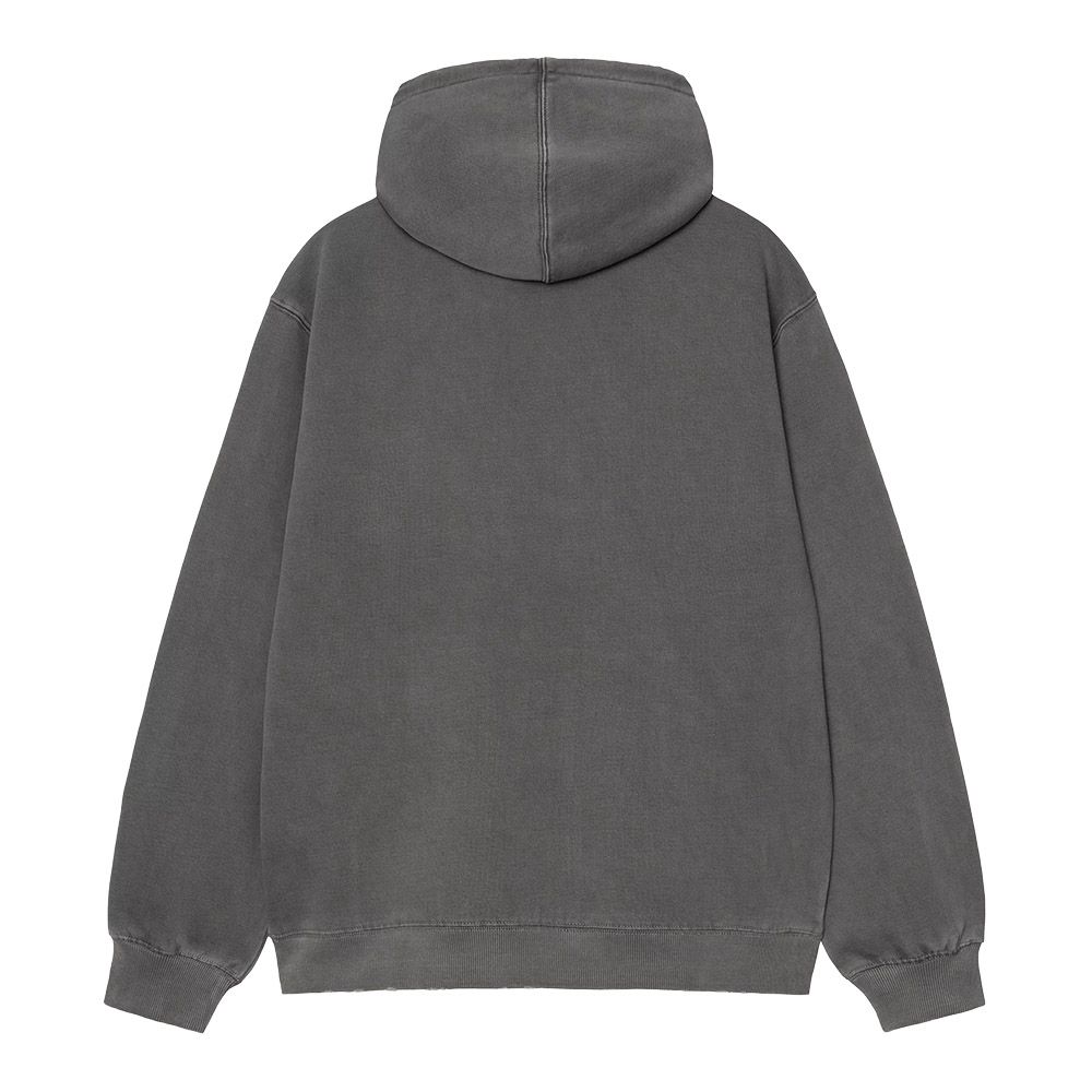 Carhartt WIP Hooded Torion Sweatshirt, hooded sweatshirt built in heavy 100% cotton jersey unbrushed with loopback construction. The loopback construction leaves fabric loops visible on inner side creating structured texture and natural thermal insulation. The balloon fit redefines proportions with ample volumes and relaxed silhouette accentuated by dropped shoulders. The garment is subjected to grind treatment, mechanical process that smooths and partially wears the surface giving worn look. Adjustable hood with drawstring. Front kangaroo pocket with Carhartt WIP overdyed square label applied. Ribbed cuffs and hem in blend 96% cotton and 4% elastane that guarantee elastic recovery and fit.