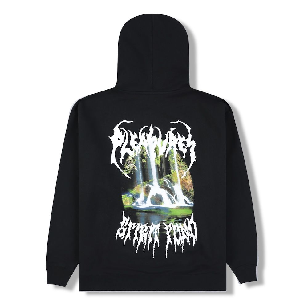 Pleasures Pond Zip Hoodie in Black, zip hoodie in fleece-lined cotton with regular fit. The back graphic features "PLEASURES" logo in death metal style lettering above photographic waterfall image with "SPIRIT POND" text below. Small white logo repeated on left chest. Full front zip for quick wear and side kangaroo pockets for practicality. Adjustable hood with drawstrings and fleece interior for warmth. The contrast between aggressive typography and serene natural landscape creates ironic visual statement. The most brutal waterfall you've ever seen on a hoodie.