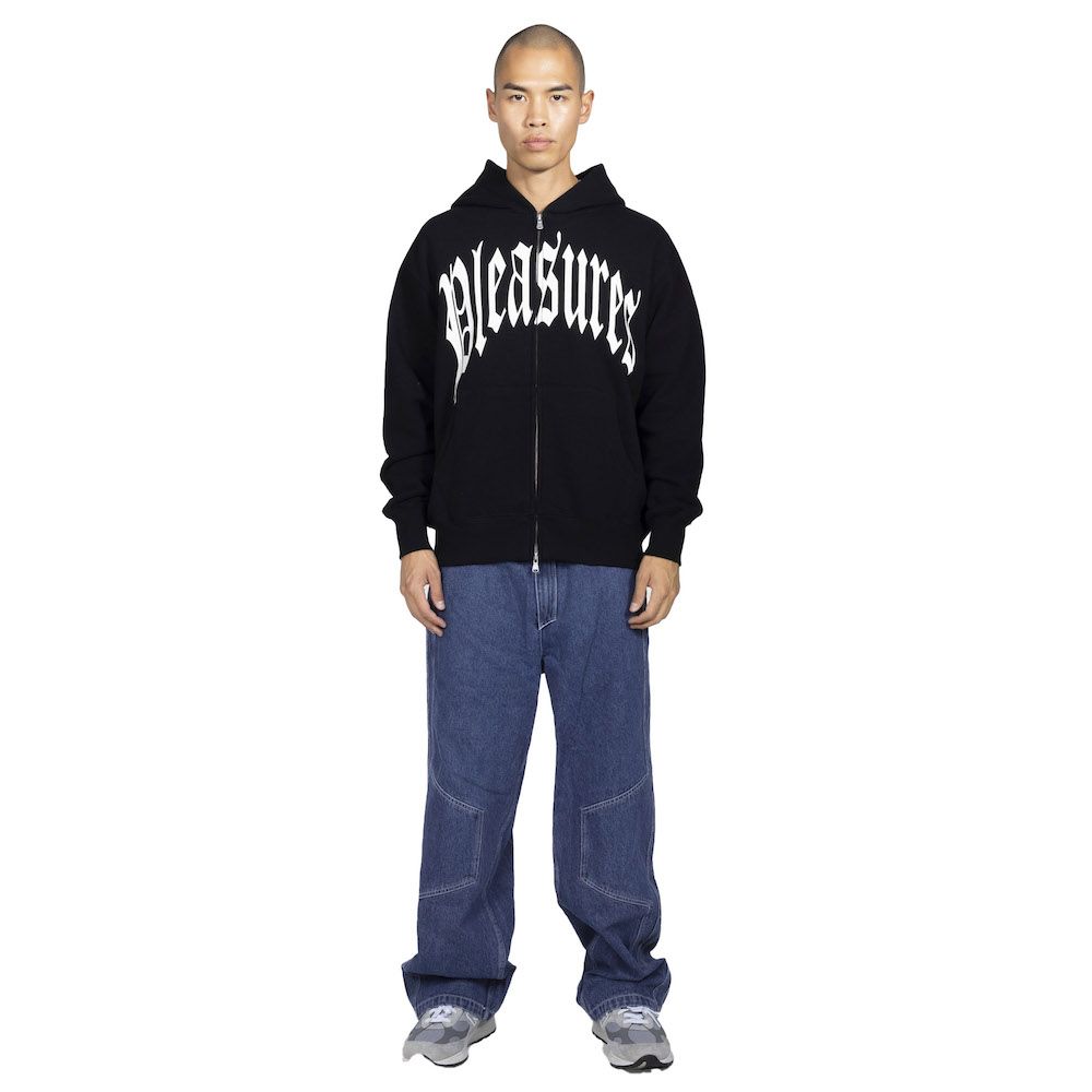 Pleasures Twitch Zip Hoodie, full zip hoodie with front logo print. Pleasures redesigns the classic length with a more contemporary cropped fit. Made in heavy and substantial French terry -- maintains supportive structure without the typical fleece appearance of traditional hoodies. The fabric withstands wear and keeps its shape over time. Full zip with double slider to adjust opening and ventilation. Front pouch pocket for essentials. The shorter cut balances well with wide pants. Works solo in daily outfits or under oversize jackets for more articulated layering. Versatile base for urban looks. Zip hoodie with updated proportions.