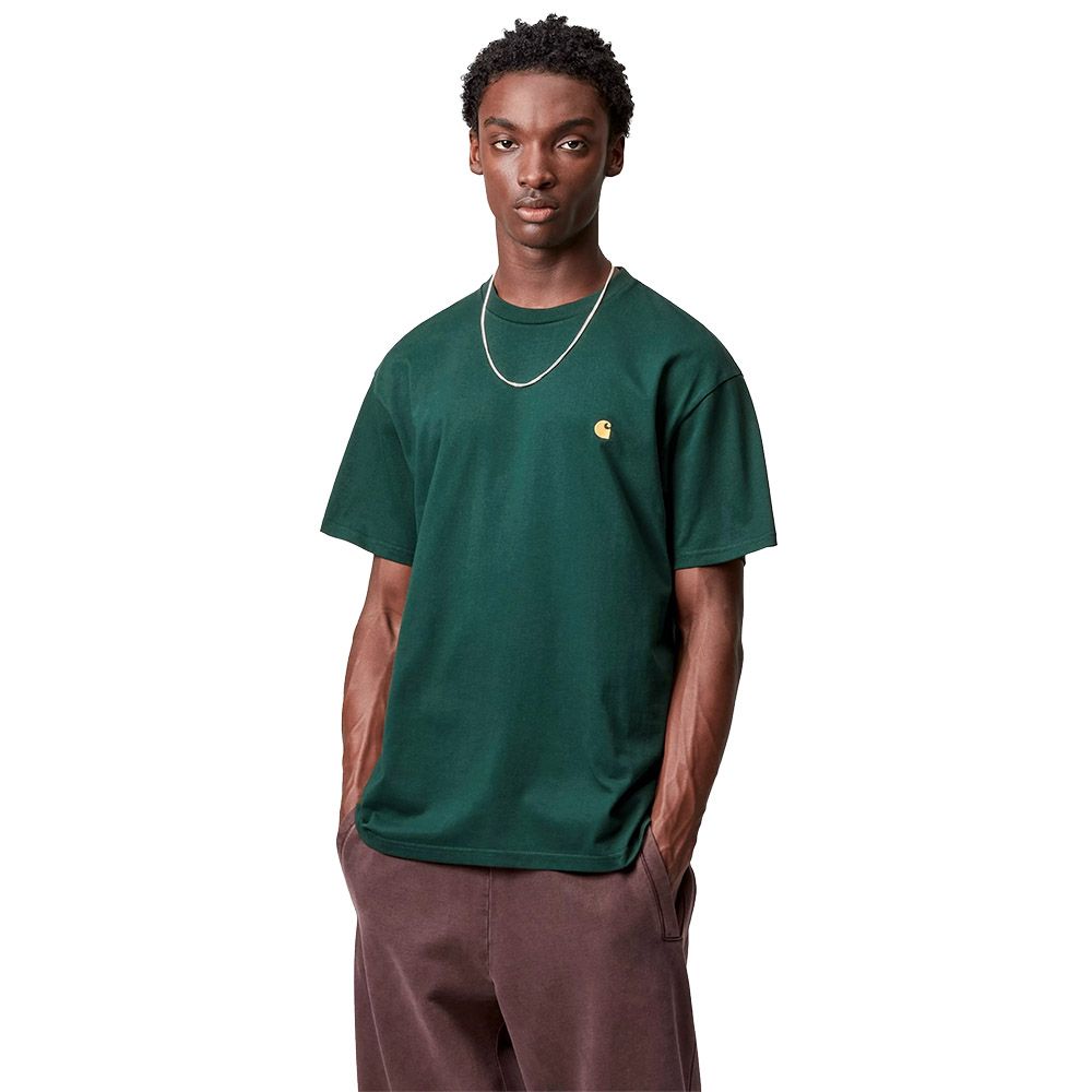 Carhartt WIP S/S Chase T-Shirt, t-shirt that is part of Carhartt WIP's Chase Program, line characterized by base jersey garments with distinctive embroidered details. Built in single jersey of 100% combed cotton at 235 grams per square meter. The combing process removes short fibers from cotton creating a smoother, more resistant yarn with uniform surface. The weight of 235 g/m² defines a medium-heavy jersey with consistent structure. Loose fit with wide and relaxed lines. Carhartt C logo embroidered on left chest side as Chase Program signature. Crewneck. Short sleeve.