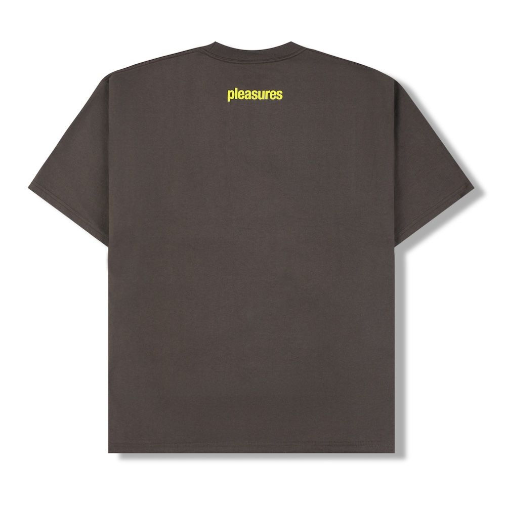 Pleasures Domination T-Shirt in Brown, heavyweight 250-gram cotton t-shirt with slightly boxy fit. The front graphic recalls vintage tour poster aesthetics with smoky image in yellow-green tones and vertical "Domination Tour 1986" text accompanied by international city list with dates. Yellow "pleasures" logo on back neck. Heavy cotton jersey ensures structure and durability while substantial weight offers comfort without transparency. The graphic ironizes 1980s music tours with nostalgic and underground approach. Works well with denim or workwear pants for streetwear looks mixing cultural references and countercultural attitude.