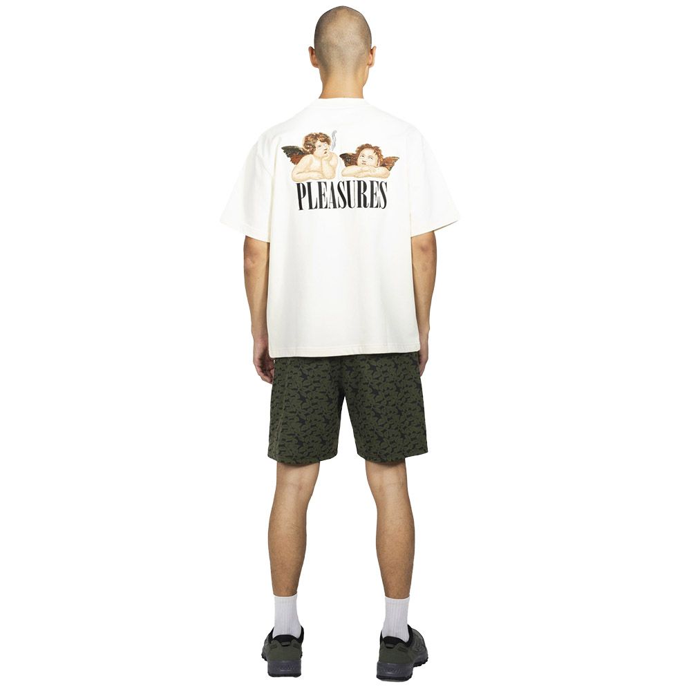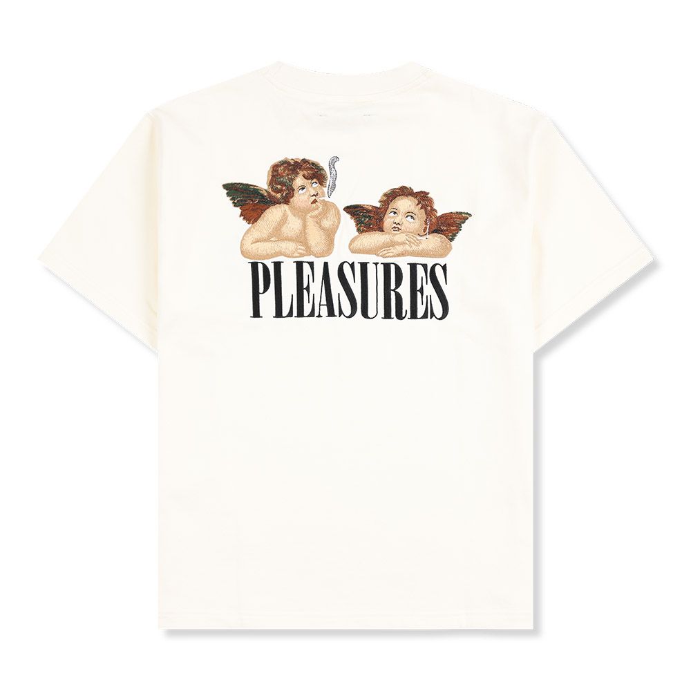 Pleasures Dynamic Short Sleeve Crewneck, a french terry t-shirt with 400 GSM weight in 90% cotton and 10% polyester blend. The boxy fit drapes softly on the shoulders. The fabric has substantial weight that gives body to the garment and keeps it structured without stiffness. Embroidered artwork depicts angels on chest and back, with Pleasures lettering integrated into the graphics. This is the heaviest t-shirt ever made by the brand: a deliberate choice to create a solid piece that holds its shape and withstands daily wear. French terry works well at this weight, maintaining softness despite the thickness.