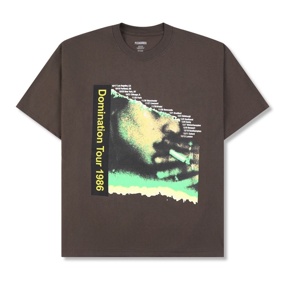 Pleasures Mirror T-Shirt in Desert Green, heavyweight 250-gram cotton t-shirt with fit between regular and boxy. The front graphic features a white cat inside an ornate baroque-style mirror with "PLEASURES" text above and "Would you for a friend?" below. Heavy cotton jersey ensures structure and durability while substantial weight offers comfort without transparency. The slightly boxy fit works well for layering under jackets or relaxed streetwear looks. The ironic cat graphic creates a visual statement that works for those seeking pieces with distinctive personality.