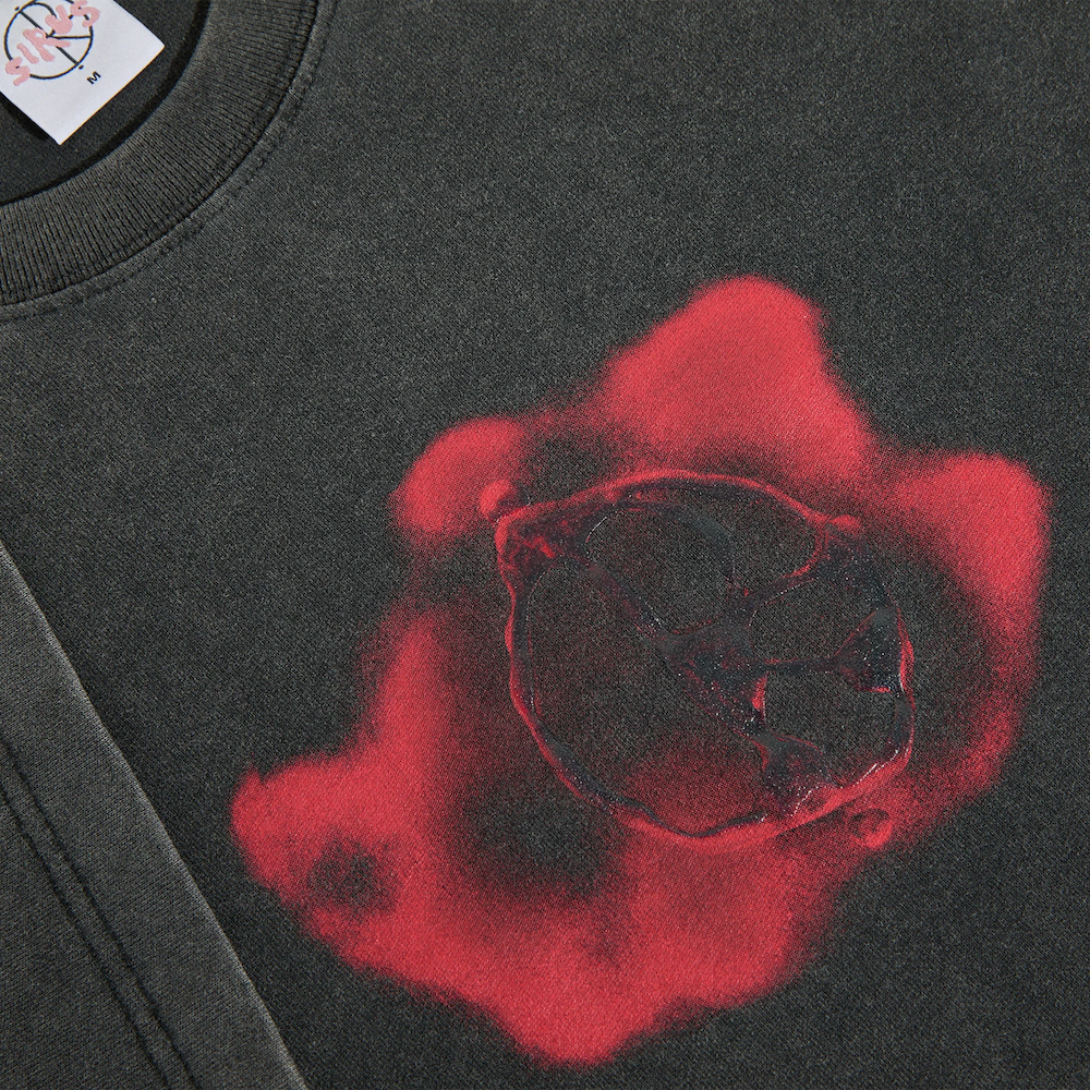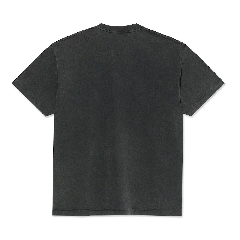 Polar Skate Co. Metal Logo Tee in Silver Black, t-shirt in 100% cotton with pre-shrunk double jersey fabric. The dark grey base features washed effect creating irregular fades on the fabric. The chest graphic shows a black and white image surrounded by red spray effect. The back is clean without prints. The regular fit offers comfort without being too tight or loose. Double jersey has more body and durability than standard jersey, while pre-shrunk treatment reduces risk of shrinkage after washing.
