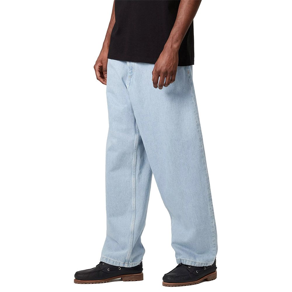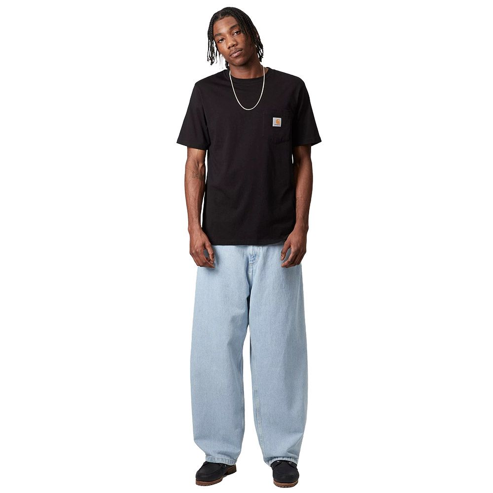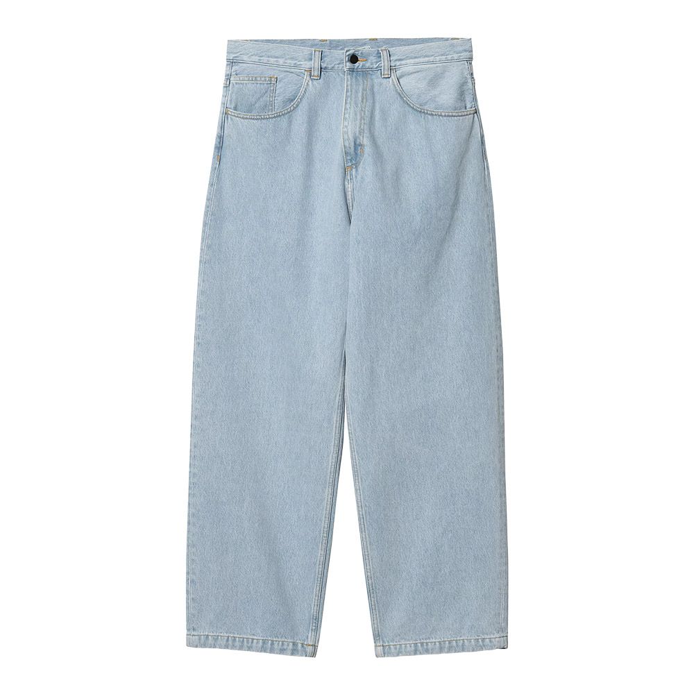 Carhartt WIP Brandon Pant, trousers built from heavy 100% cotton Smith denim that retains structure during daily use. The loose straight fit with low crotch creates wide volumes and a stable straight leg from knee to hem. The dense fabric maintains its shape after repeated washing and supports durability in high-stress areas. The reinforced back yoke helps distribute tension across the lower back, while front and back pockets provide functional storage without affecting the line. A zip fly and durable stitching complete a build designed for regular wear. The fit runs generous; those preferring a closer line may consider one size down. Square label on the back pocket.
