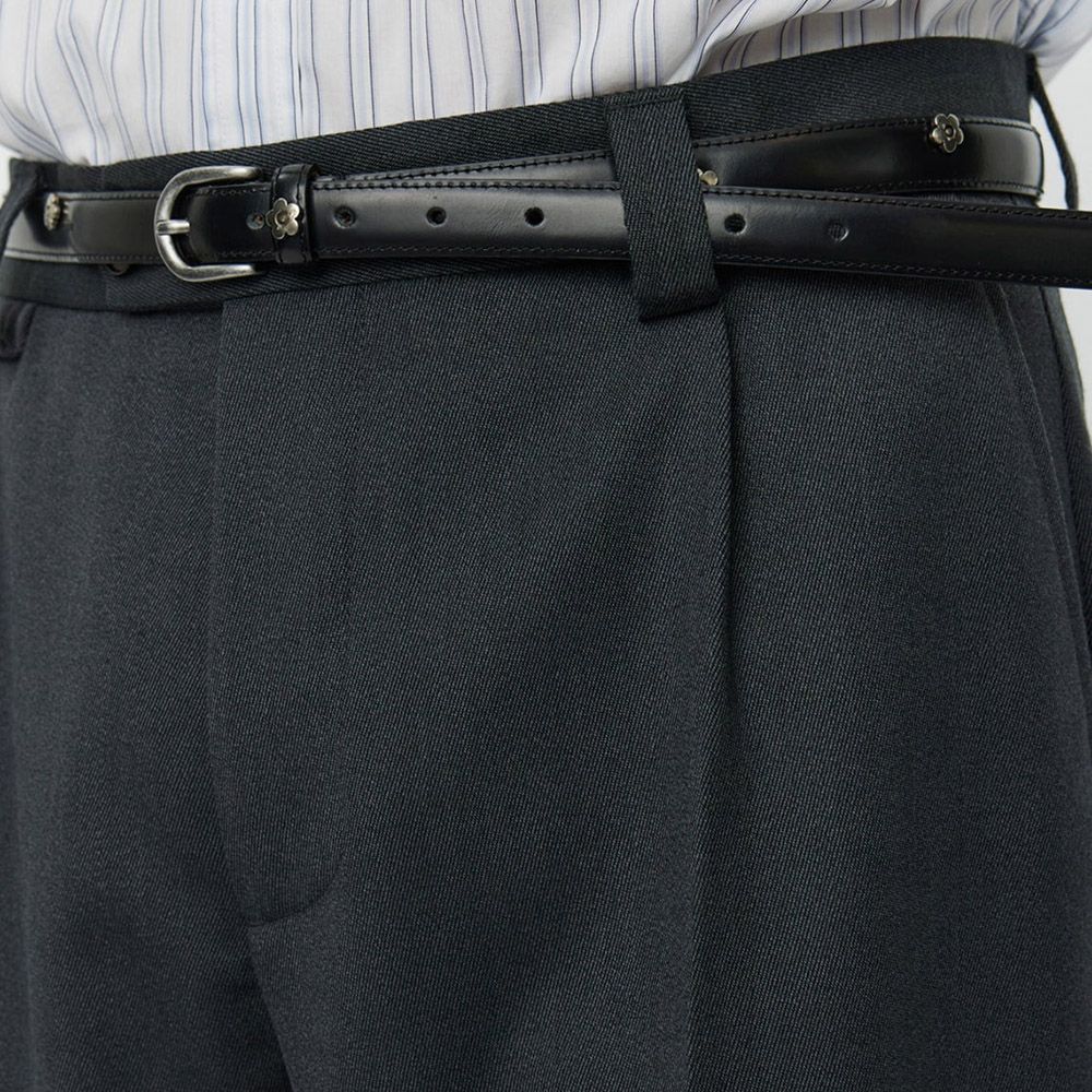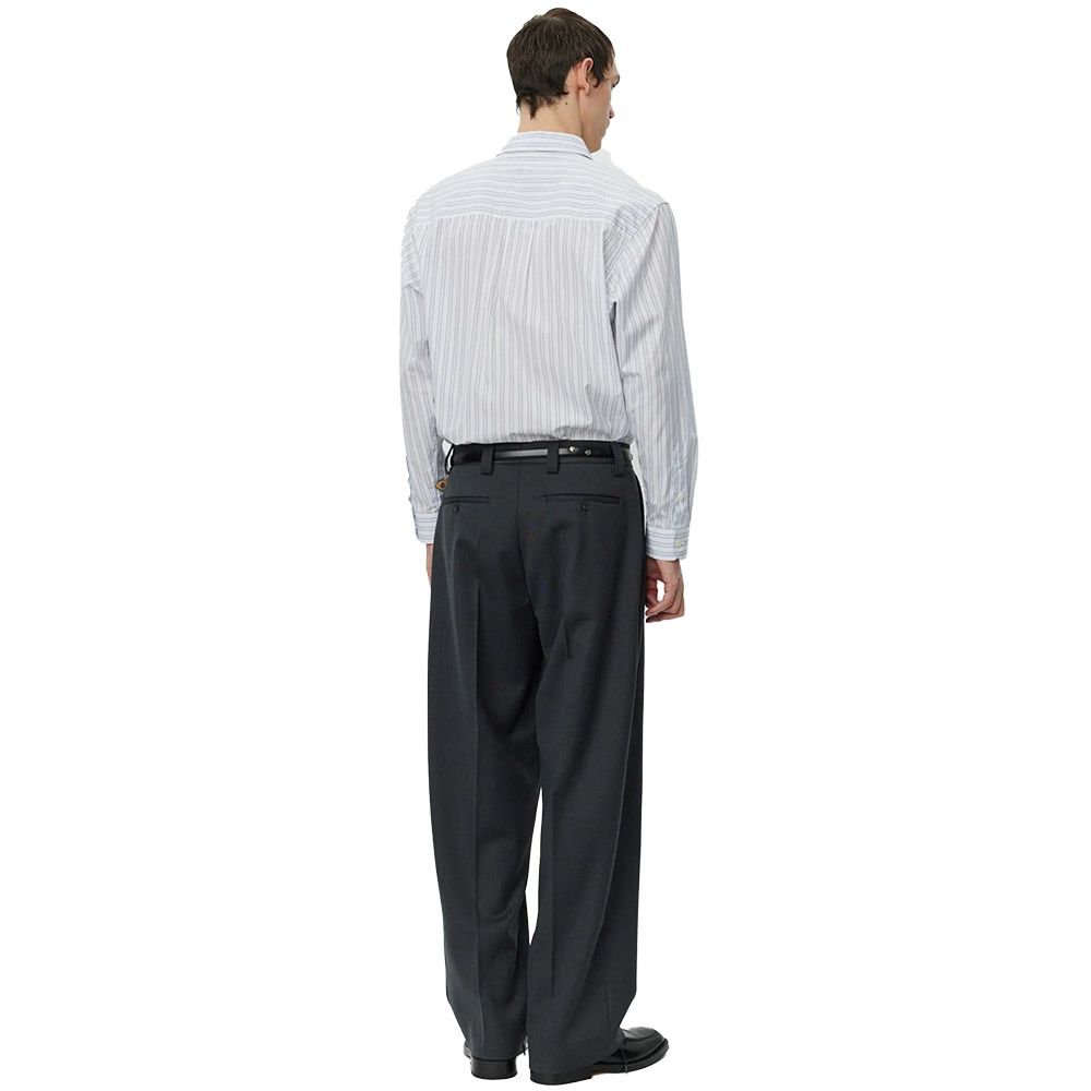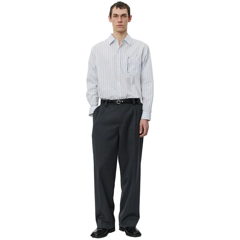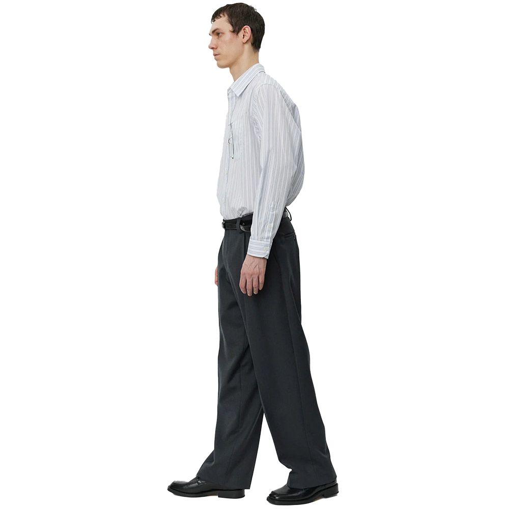 mfpen Service Trousers, trousers in Italian deadstock wool twill with wide straight fit and mid-rise. Construction features single front pleats and deep side pockets paired with rear welt pockets. Closure with black resin buttons, hook-and-eye and YKK zip for security. The dense fabric shows a subtle grey two-toned weave that adds visual depth. Internal lining in recycled polyester. Recovered fabric worked in Portugal for a sustainable approach.
