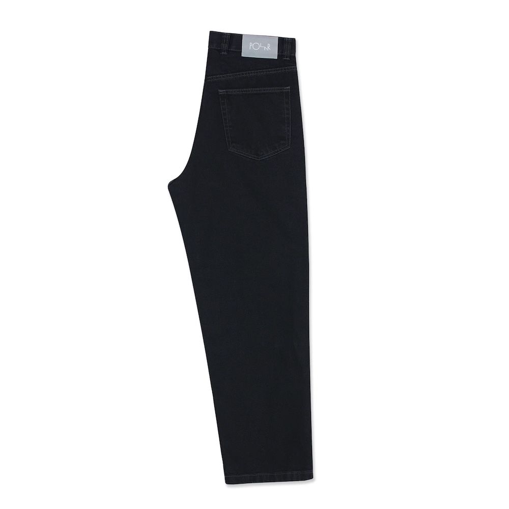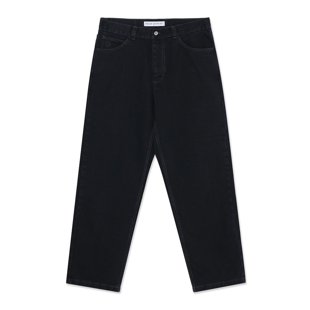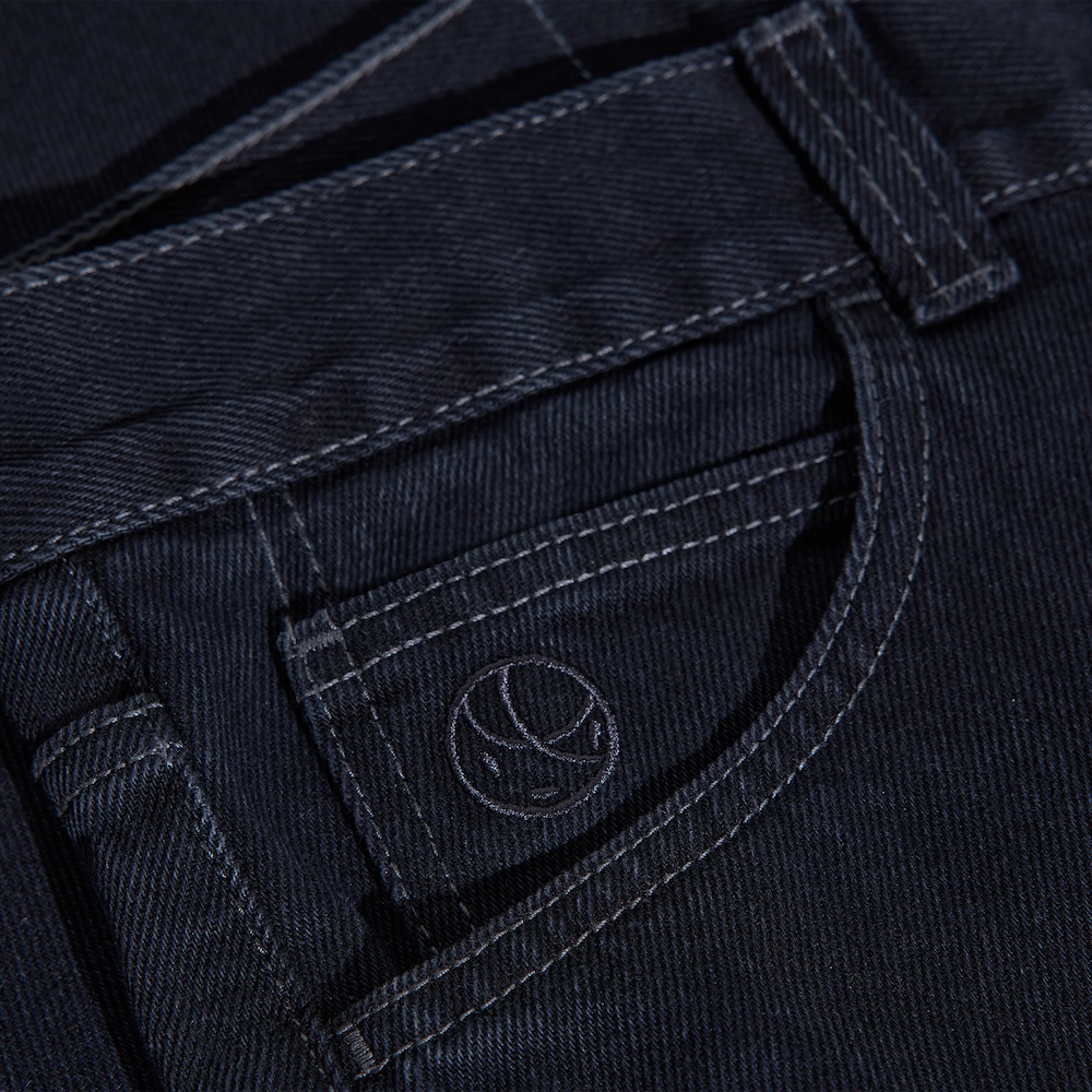 Polar Skate Co. 91 Pants in Aged Black, five-pocket trousers in 435-gram cotton with loose fit and straight leg. High waist and straight cut create classic skate silhouette. Closure with YKK zip and customized YKK button for durability. Embroidery on change pocket and woven label complete brand details. The 435-gram weight offers robustness that withstands intensive use while maintaining comfort. The loose cut with high waist works for skating without limiting movement. The aged black provides immediate lived-in tone. For those seeking skate trousers with weight and structure without being stiff.