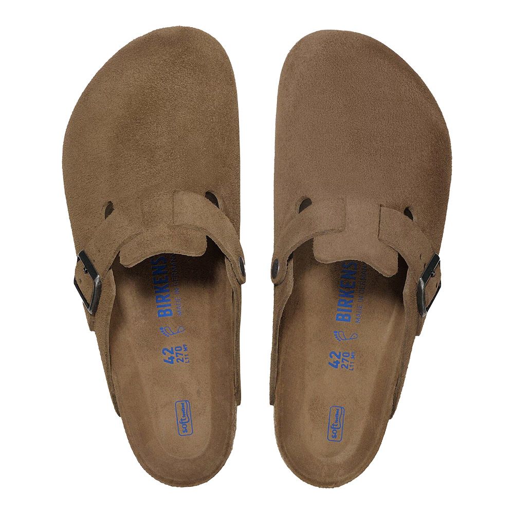 Birkenstock Boston Soft Footbed, a Dark Tea Tonal suede clog. Soft upper that moulds to the foot, original Birkenstock anatomical footbed with latex foam insert for immediate comfort. Breathable suede insole, cork and latex footbed, lightweight and cushioning EVA sole. Adjustable strap with metal buckle.