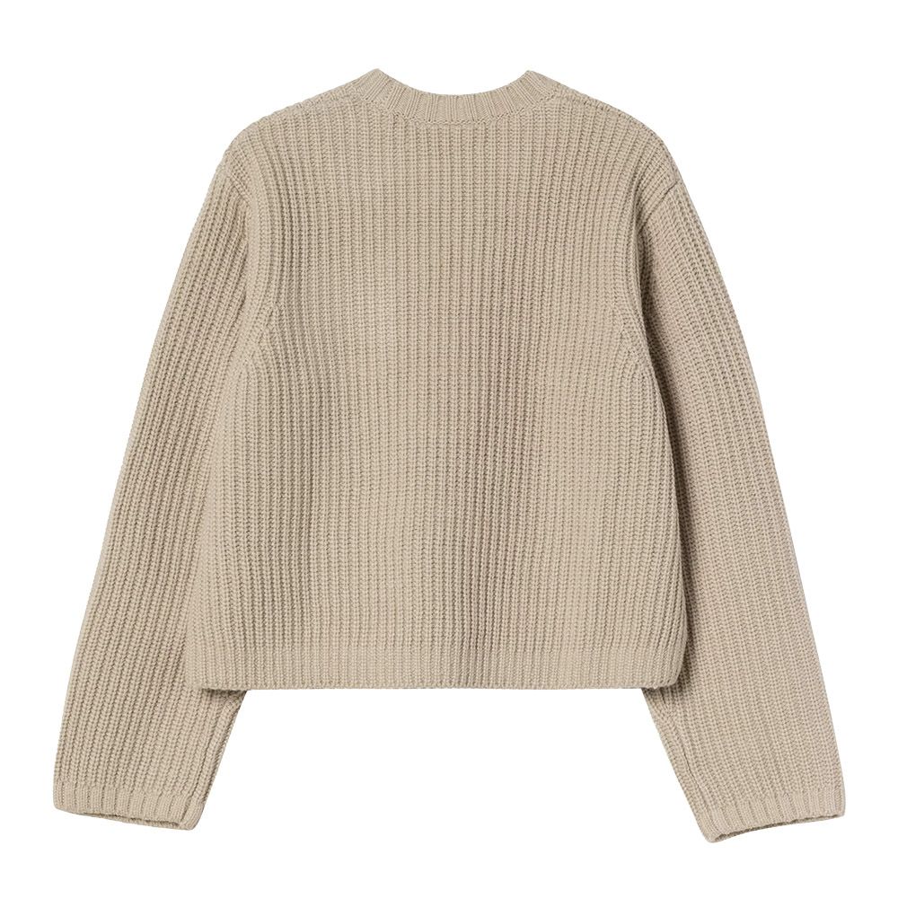 Carhartt WIP W' Mira Sweater, women's sweater in mixed acrylic, wool and nylon yarn with 3 gauge construction. The build features shaping at the armhole for natural fit and movement comfort. The applied chest pocket with square fabric label adds functionality and characteristic brand detail. The fiber blend ensures wool softness with acrylic durability and easy maintenance. Essential design for versatile layering.