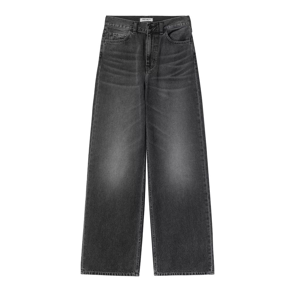 Carhartt WIP W' Jane Pant, trousers built in Fairfield denim 100% organic cotton at 11 ounces. The fabric is subjected to treatment that gives unique shade and texture, differentiating each garment. High waist that positions the waistline above the hips. Slightly flared leg from thigh to bottom creates balanced silhouette and favors comfortable wearability. Loose fit with relaxed volumes. Reinforced back yoke following workwear tradition. Bartack stitching applied in high-wear points like pockets and belt loops guarantee superior resistance. Carhartt WIP square label on back pocket. Front fly with zip closure.