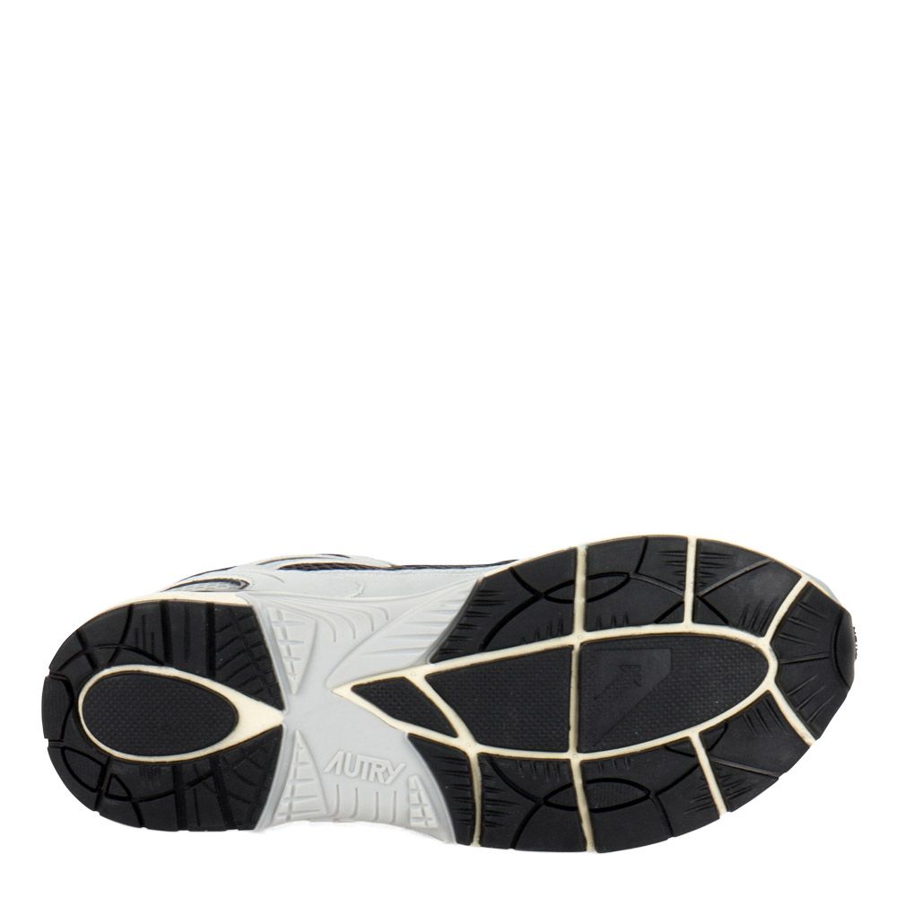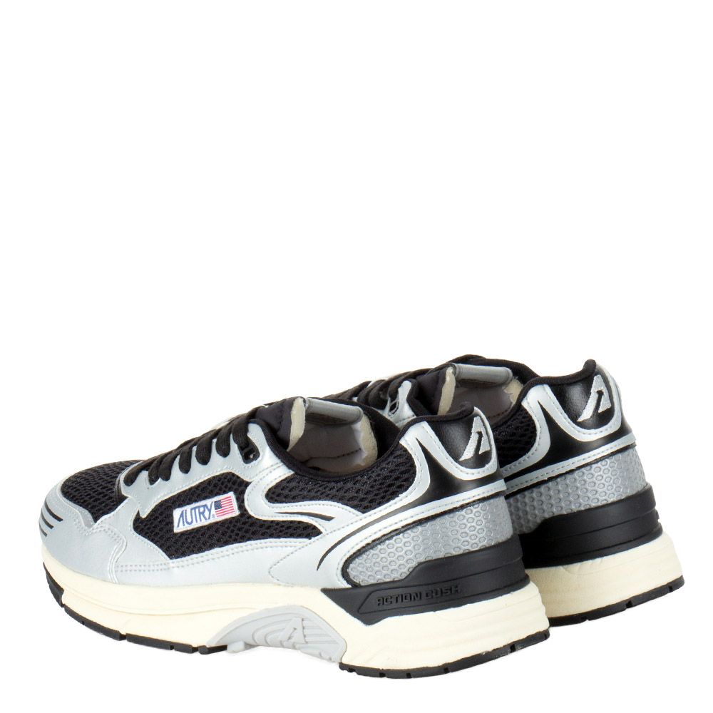 AUTRY Hyperway Low Woman, a running sneaker with silver and black mesh upper, synthetic leather inserts. Breathable mesh toe, padded mesh collar, nylon tongue with jacquard label, jacquard side logo, embossed leather back counter. Sole with Action Cush technology for cushioning, TPR stabilizer for support. 1.5 mm raised mesh insole, cotton terry lining. Includes fabric pouch.