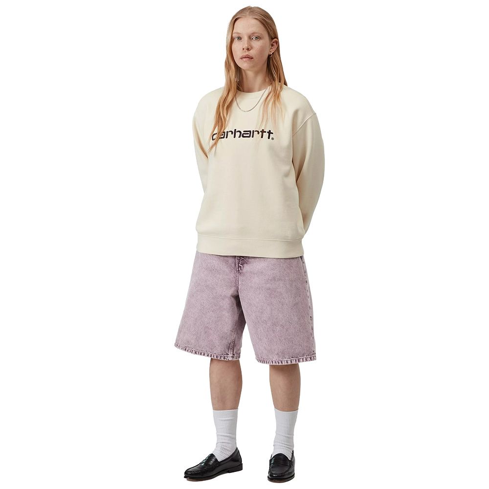 Carhartt WIP W' Brandon Short, pantaloncini donna in denim di cotone pesante con trattamento chalk wash per una finitura sbiadita effetto polvere. Fit loose con vita regolare. Costruzione rinforzata con sprone posteriore e impunture a travetta nei punti di maggior usura. Tasche anteriori, tasca portamonete e tasche posteriori con etichetta quadrata in tessuto. Chiusura con cerniera.