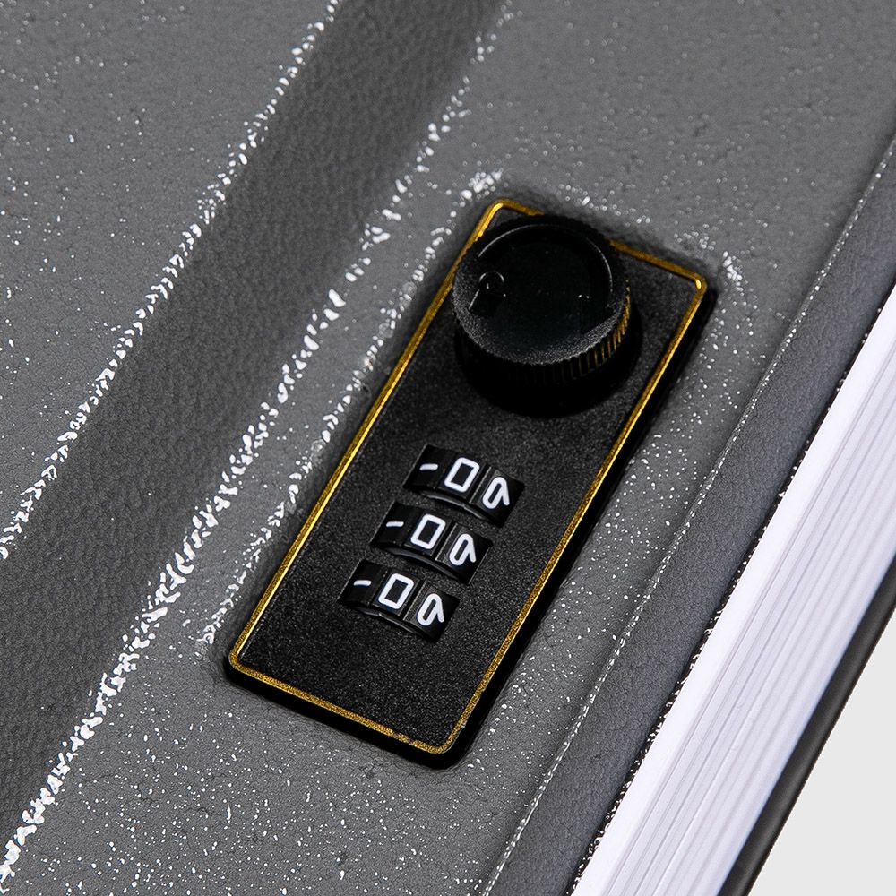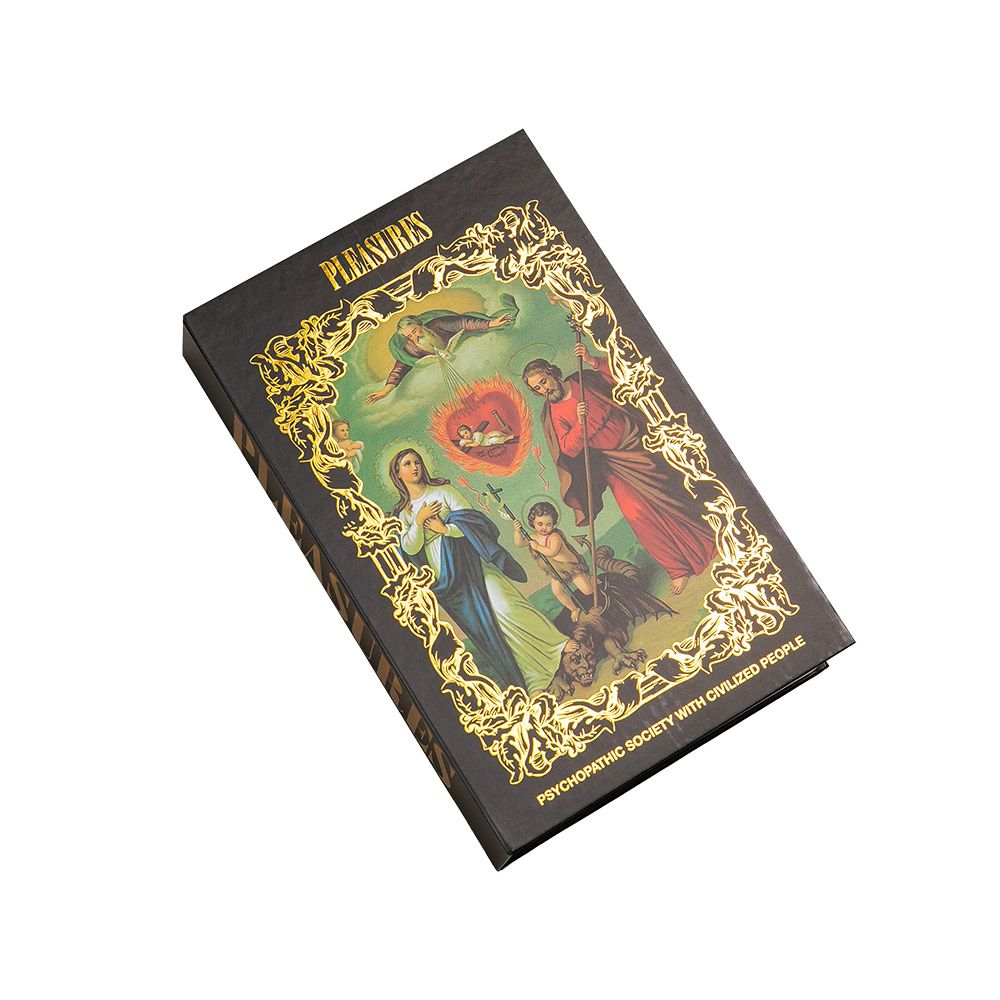Pleasures Saint Booksafe, cassaforte camuffata da libro con copertina rigida decorata con immagini religiose barocche. L'esterno replica l'estetica di una bibbia vintage con grafica sacra e cornice dorata ornamentale mentre l'interno in metallo grigio offre uno scomparto sicuro con lucchetto a combinazione a tre cifre. Dimensioni 24 x 15.5 x 15.5 cm permettono di nascondere oggetti essenziali in bella vista su una libreria. La scritta "PLEASURES" in verticale oro sul dorso conferma l'identità ironica del pezzo. Il lucchetto con finiture dorate aggiunge dettaglio premium alla funzionalità. Santifica i tuoi segreti con un lucchetto a tre cifre.