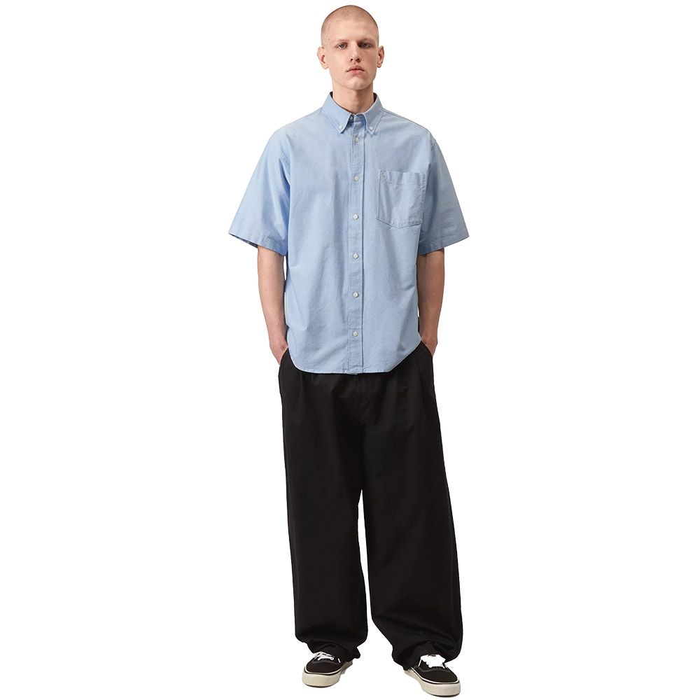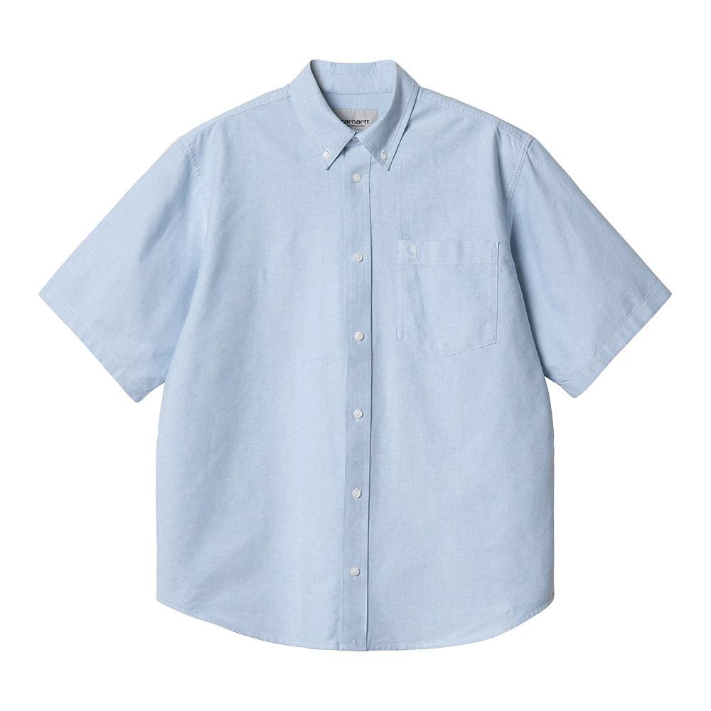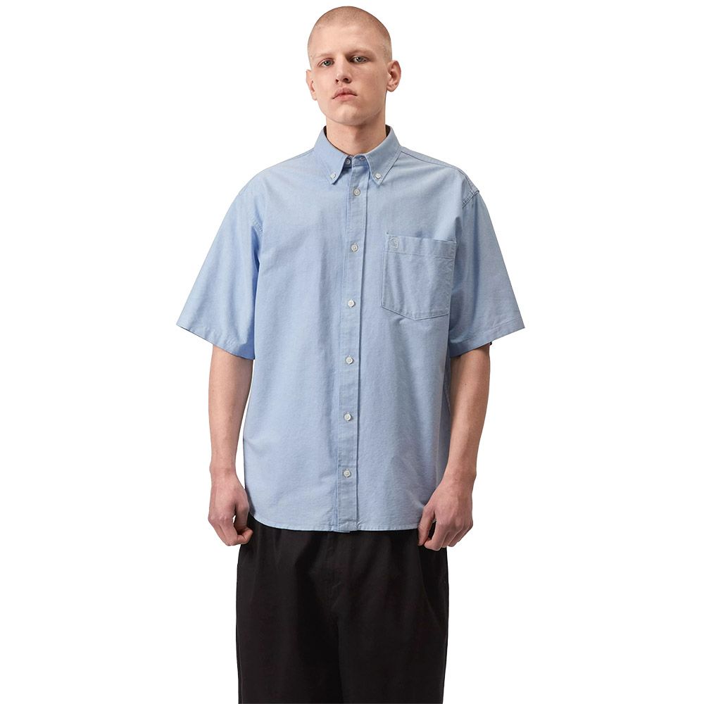 Carhartt WIP S/S Braxton Shirt, camicia a maniche corte in cotone Oxford leggero tinto in filo. Il tessuto è stato lavato per una mano più morbida. Fit ampio. Colletto, abbottonatura frontale, tasca sul petto. Logo ricamato.