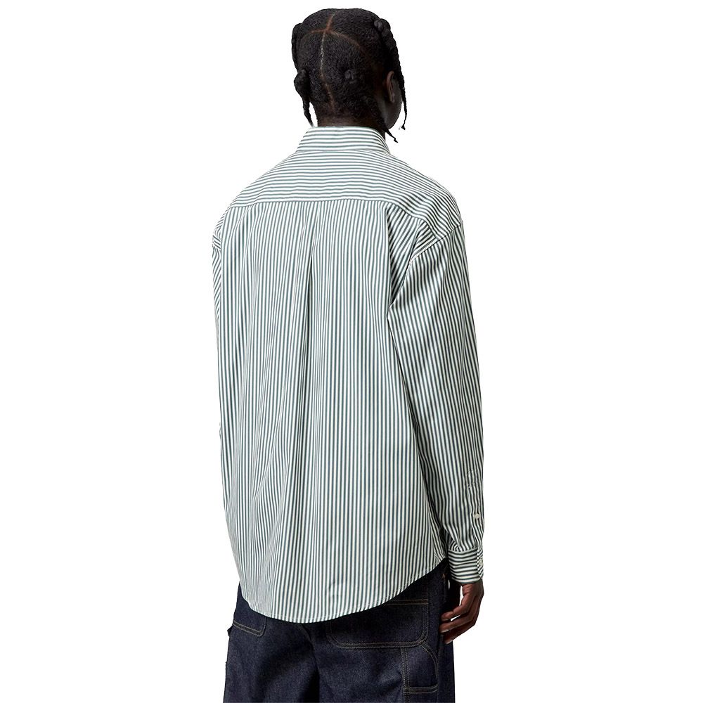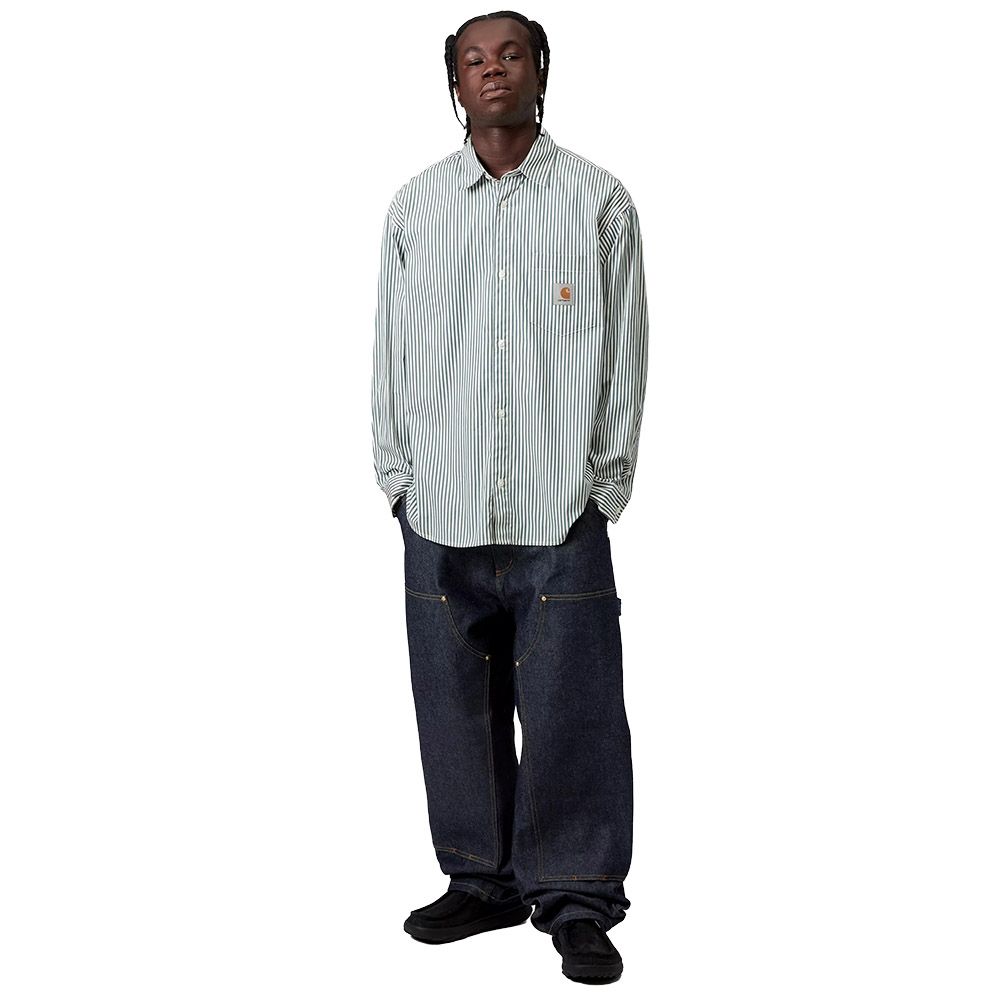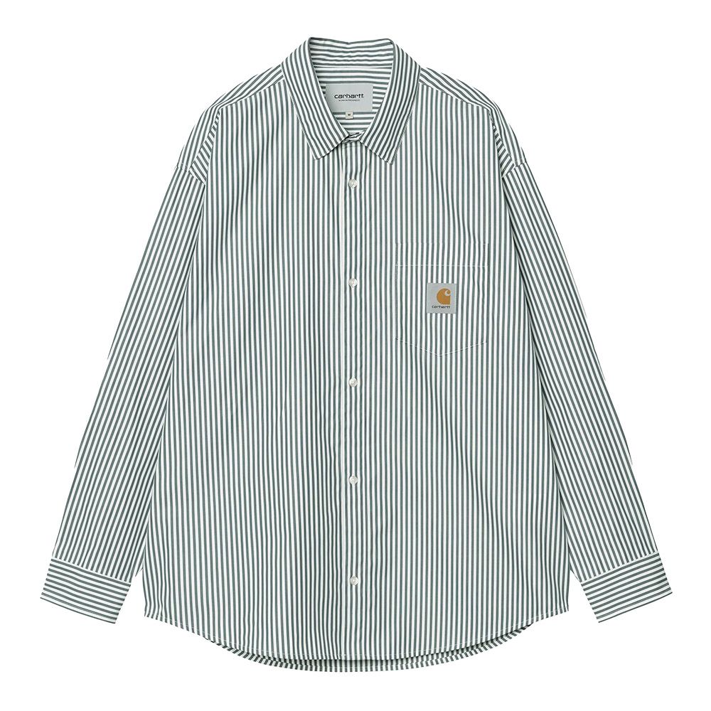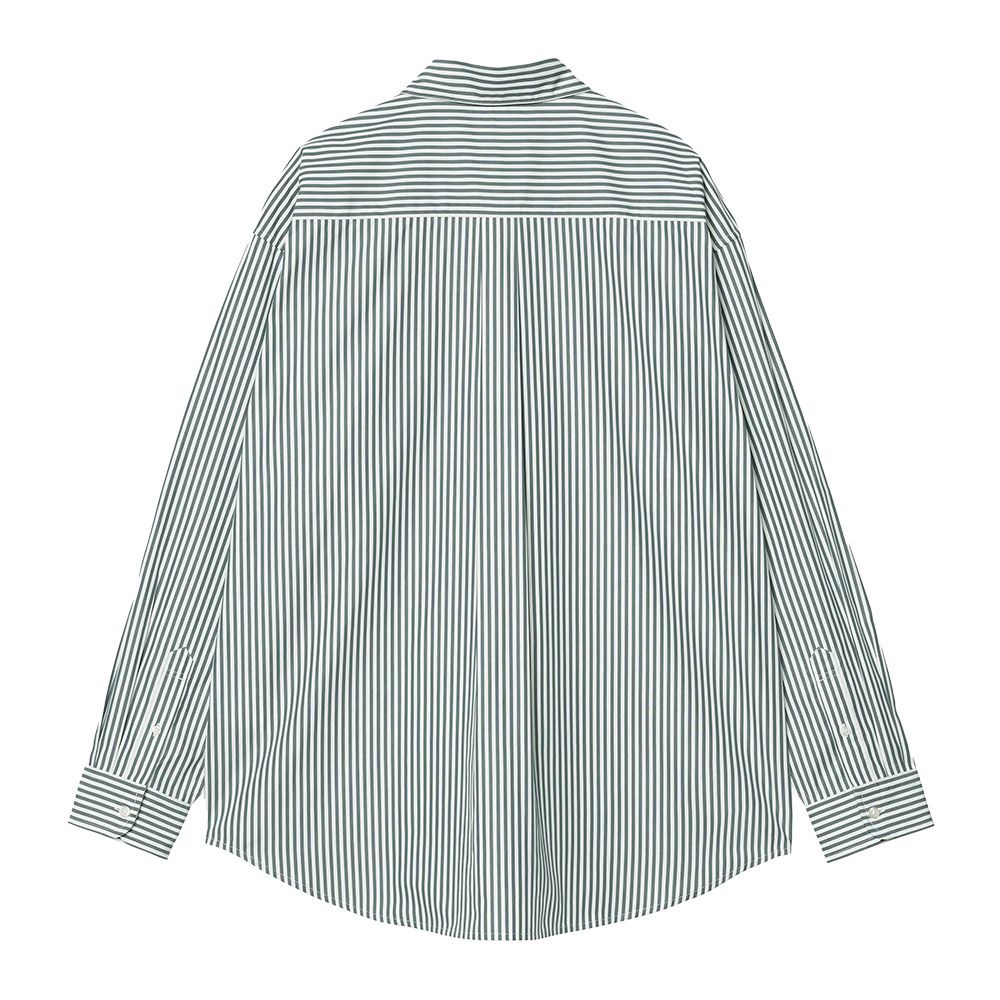 Carhartt WIP L/S Daldry Shirt, camicia in popeline di cotone leggero a righe con vestibilità oversize che genera volumi ampi e una caduta morbida. La struttura del popeline garantisce superficie liscia e resistenza all’uso quotidiano, mantenendo traspirabilità e peso contenuto. La tasca sul petto introduce un riferimento funzionale classico e ospita l’etichetta quadrata in tessuto, dettaglio tipico del marchio che identifica il modello senza creare contrasti eccessivi. La costruzione rimane essenziale, pensata per un impiego versatile in contesti differenti.