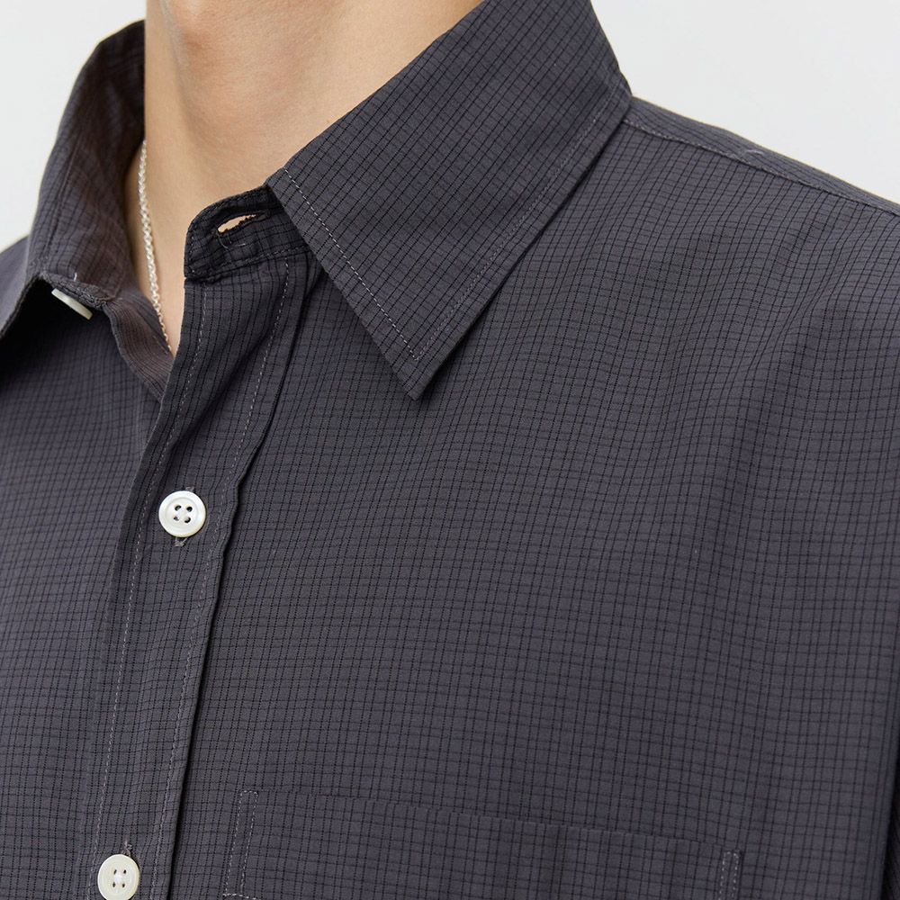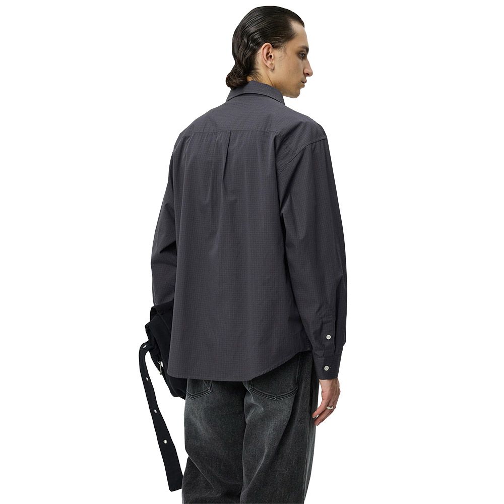 Mfpen Executive Shirt, camicia in popeline di cotone con micro quadretto nero su fondo grigio caldo. Il tessuto ha una mano asciutta. Il fit è rilassato con spalle scese e orlo arrotondato. Colletto aperto, abbottonatura frontale, pieghe sullo sprone posteriore e taschino al petto. Bottoni in resina color avorio.