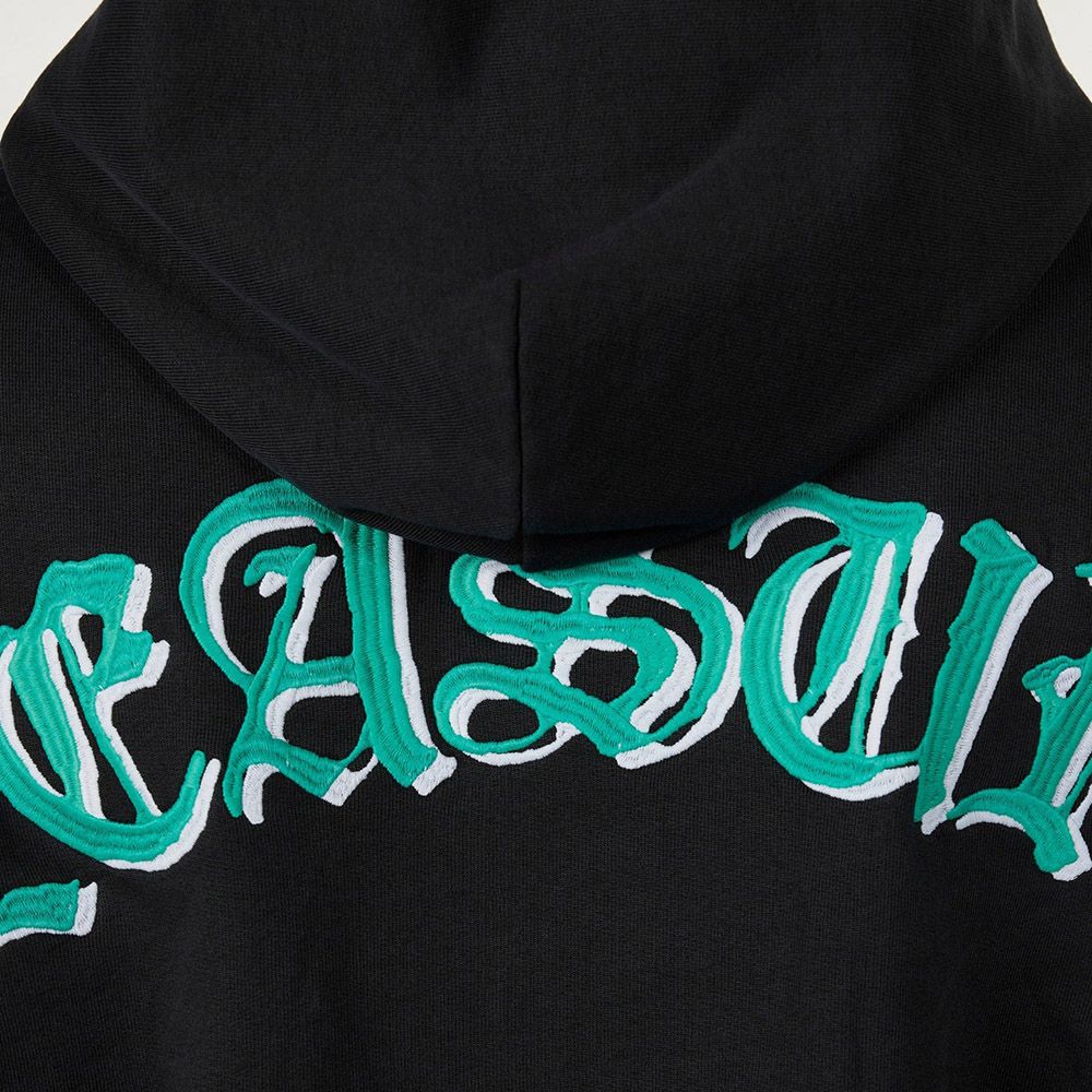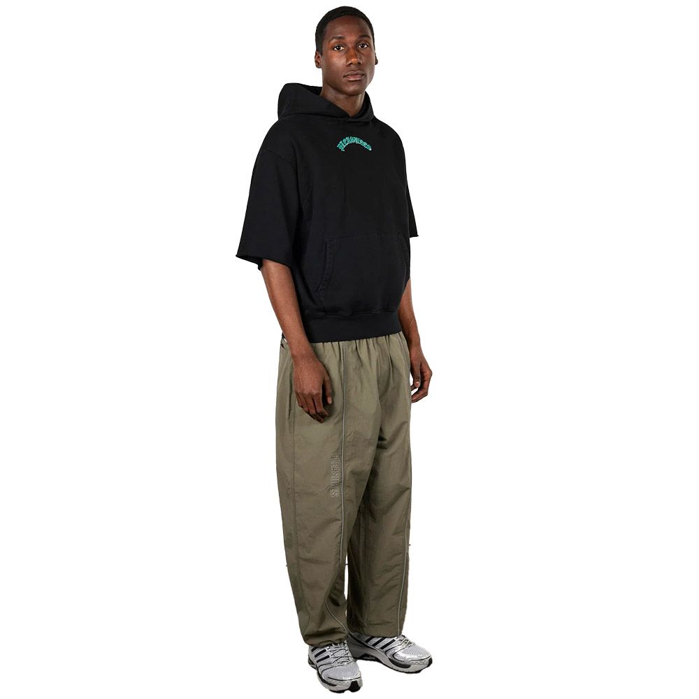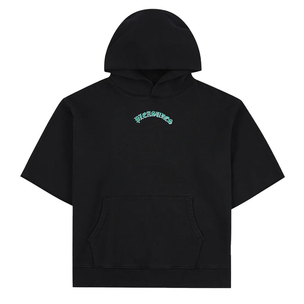 PLEASURES Cut Off Hoodie, felpa a maniche corte in French Terry pesante con cappuccio. Maniche con bordo a taglio vivo. Logo "PLEASURES" ricamato ad arco in carattere gotico verde acqua sul petto, versione grande sulla schiena. Tasca a canguro.