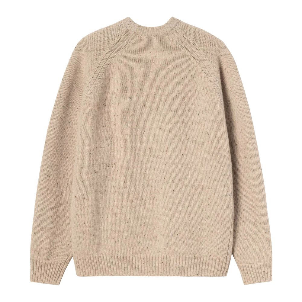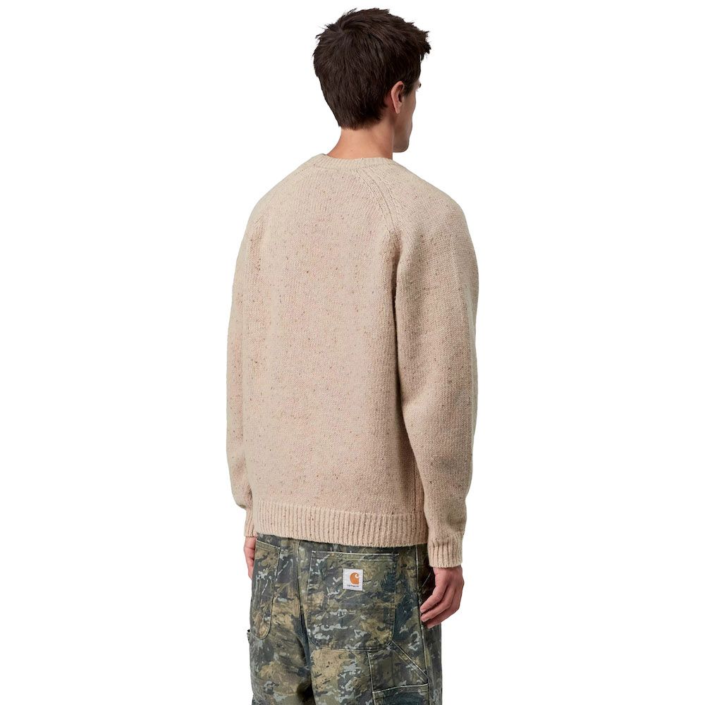 Carhartt WIP Anglistic Sweater, maglione costruito in blend 78% lana di agnello, 19% cotone e 3% acrilico lavorato a 3 gauge. La lana di agnello dona calore e morbidezza, il cotone contribuisce alla traspirabilità, mentre l'acrilico aggiunge resistenza alla struttura. Il calibro 3 gauge crea una maglia spessa e consistente con texture leggermente puntinata visibile sulla superficie. Regular fit con linee standard e proporzioni classiche. Maniche raglan permettono mobilità naturale delle spalle grazie alla cucitura diagonale che parte dal collo. Girocollo con bordo a coste. Etichetta quadrata Carhartt WIP applicata sull'orlo inferiore.