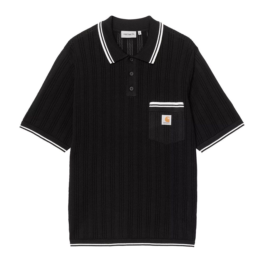 Carhartt WIP S/S Ramsey Polo, polo in maglia di cotone leggero con lavorazione traforata allover. Finiture a righe a contrasto. Mezza apertura frontale, tasca sul petto. Etichetta quadrata in tessuto.
