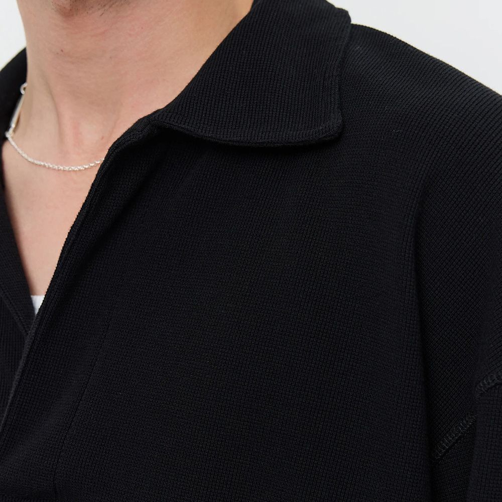 mfpen Rolodex Polo, polo in jersey di cotone organico con mini lavorazione a nido d'ape e mano asciutta. Fit rilassato con spalle scese. Apertura frontale senza bottoni, cuciture flatlock e spacchi laterali. Lavata in capo per maggior morbidezza.