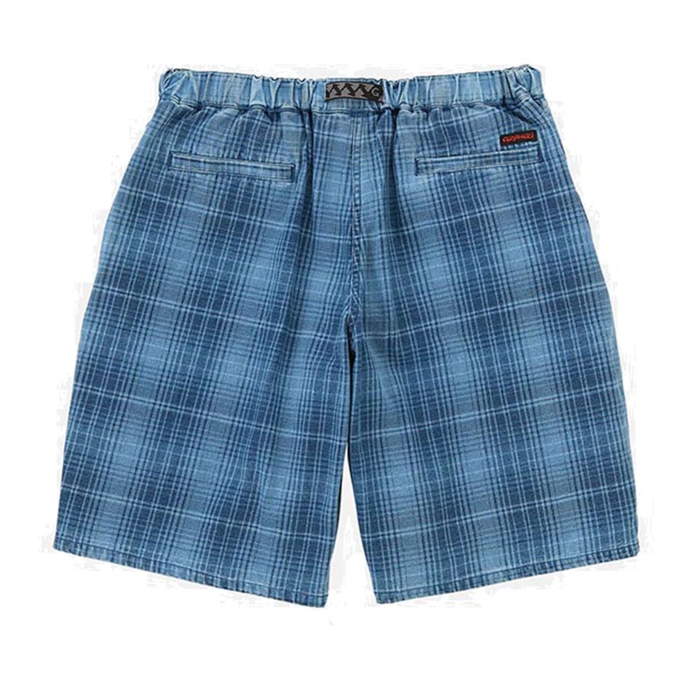 Gramicci Lagoon Short Denim Plaid, pantaloncini in denim plaid da 10 oz con pattern a quadri ottenuto tramite filato indaco. Il fit è rilassato con vita elasticizzata e sistema di cintura integrato Gramicci. Peso medio, adatto alle giornate estive senza essere troppo leggero. Interno gamba 28-30 cm circa.