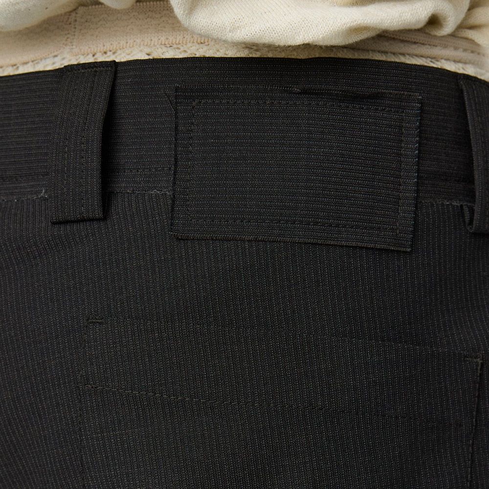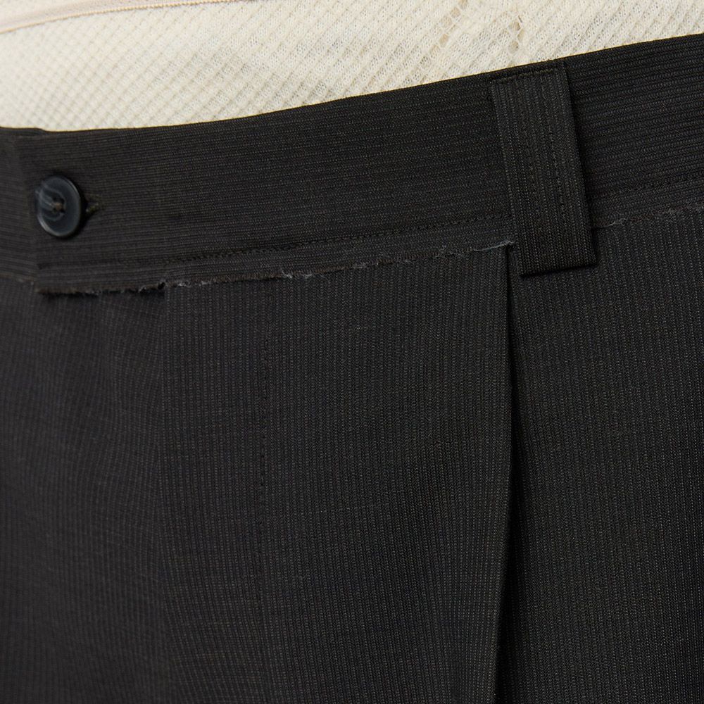 mfpen Classic Shorts, pantaloncini in lana deadstock con righe grigio scuro su fondo marrone scuro. Fit rilassato, vita media, pinces singole. Tasche laterali, tasche posteriori a toppa, chiusura con bottone, gancio e zip YKK. Dettagli a taglio vivo che si sfrangiano naturalmente con l'uso — il capo è pensato per evolvere nel tempo.