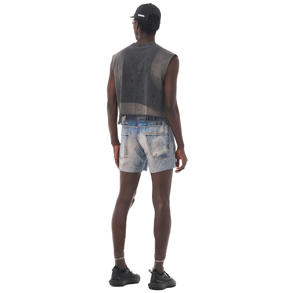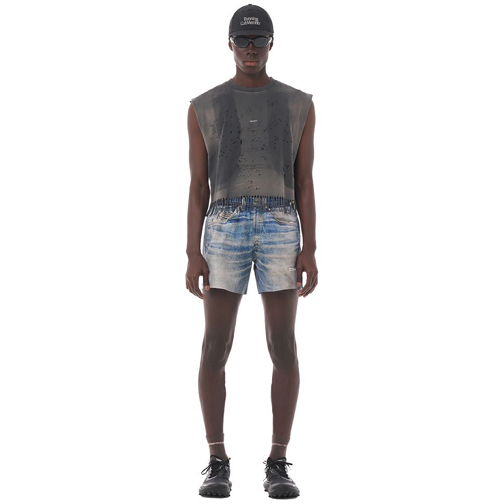 SATISFY PeaceShell™ 5" Unlined Shorts, pantaloncini da running senza fodera in PeaceShell™, tessuto giapponese leggero ad asciugatura rapida con stretch a quattro direzioni. Il tessuto è resistente ma morbido sulla pelle, progettato per scomparire durante la corsa. Stampa Digital Denim ispirata al denim vintage vissuto, reinterpretato per la resistenza. Due tasche laterali ad accesso rapido, tasca posteriore con zip anti-sudore per tenere gli oggetti essenziali al sicuro. Logo SATISFY riflettente stealth. Etichetta di manutenzione rimovibile all'esterno.