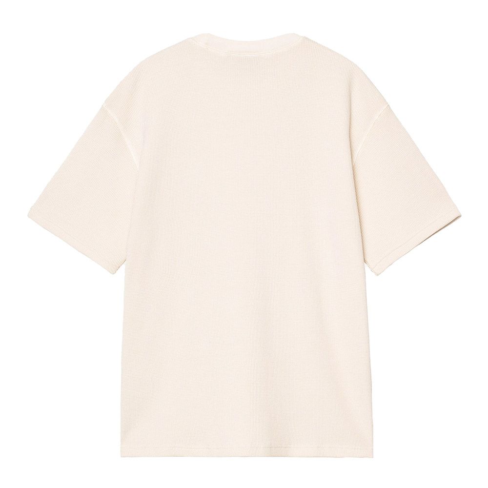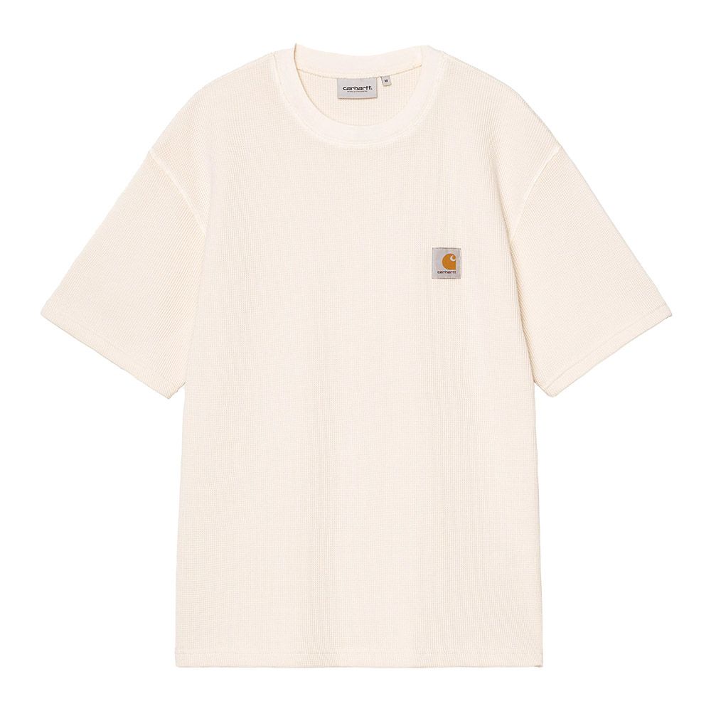 Carhartt WIP S/S Nelson Waffle T-Shirt, t-shirt a maniche corte in cotone pesante con lavorazione a nido d'ape. Il tessuto è tinto in capo per una mano più morbida e una colorazione con variazioni tipiche di questo processo. Fit ampio. Etichetta quadrata sovratinta.
