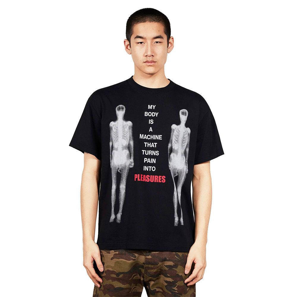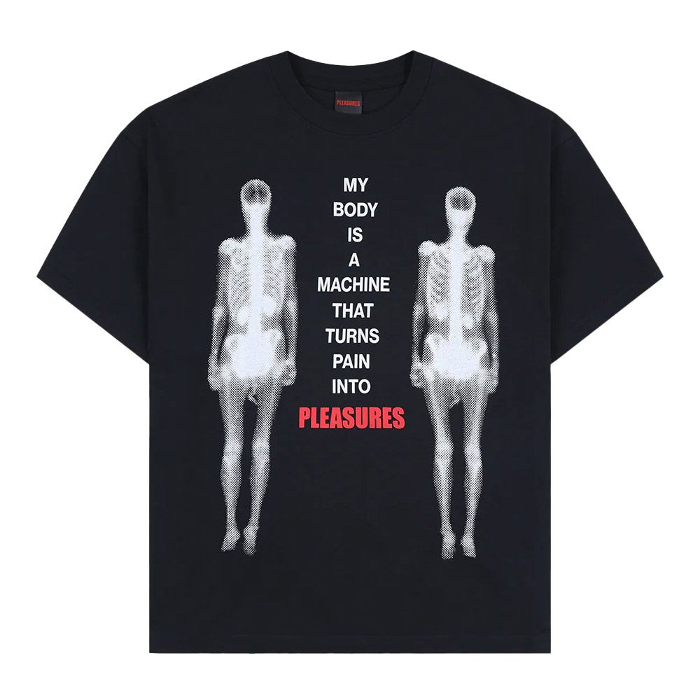 PLEASURES Machine T-Shirt, t-shirt in cotone con stampa grafica sul fronte — due figure a raggi X e scritta "My Body Is A Machine That Turns Pain Into PLEASURES". Fit boxy cropped. Cuciture a doppio ago su maniche e orlo inferiore.