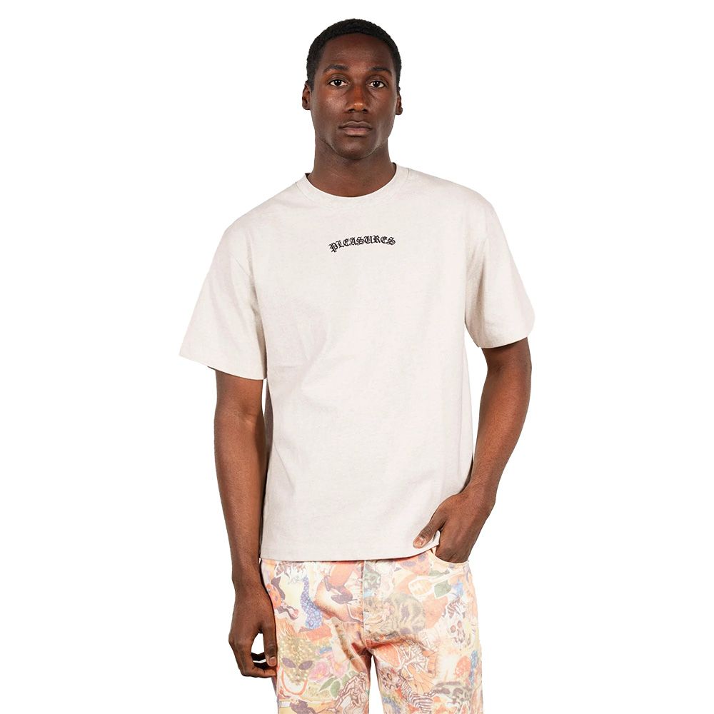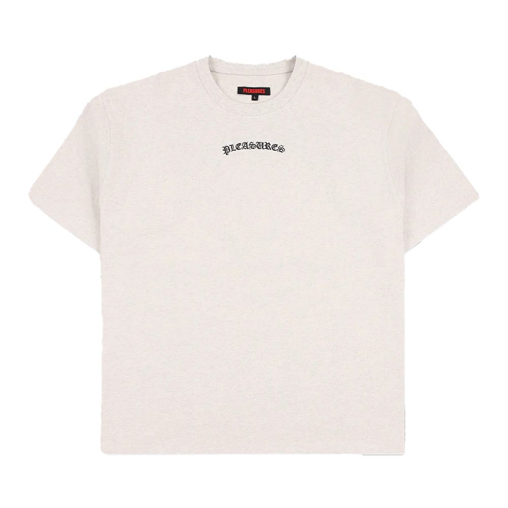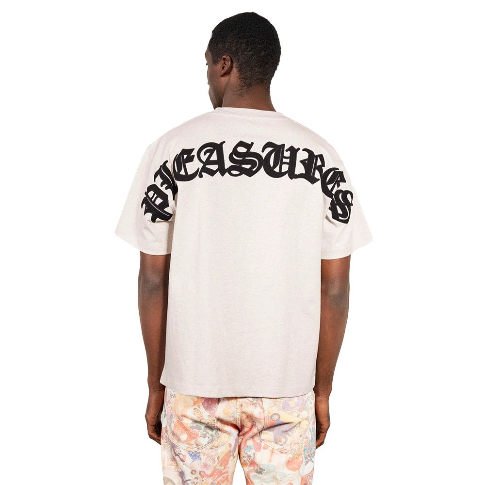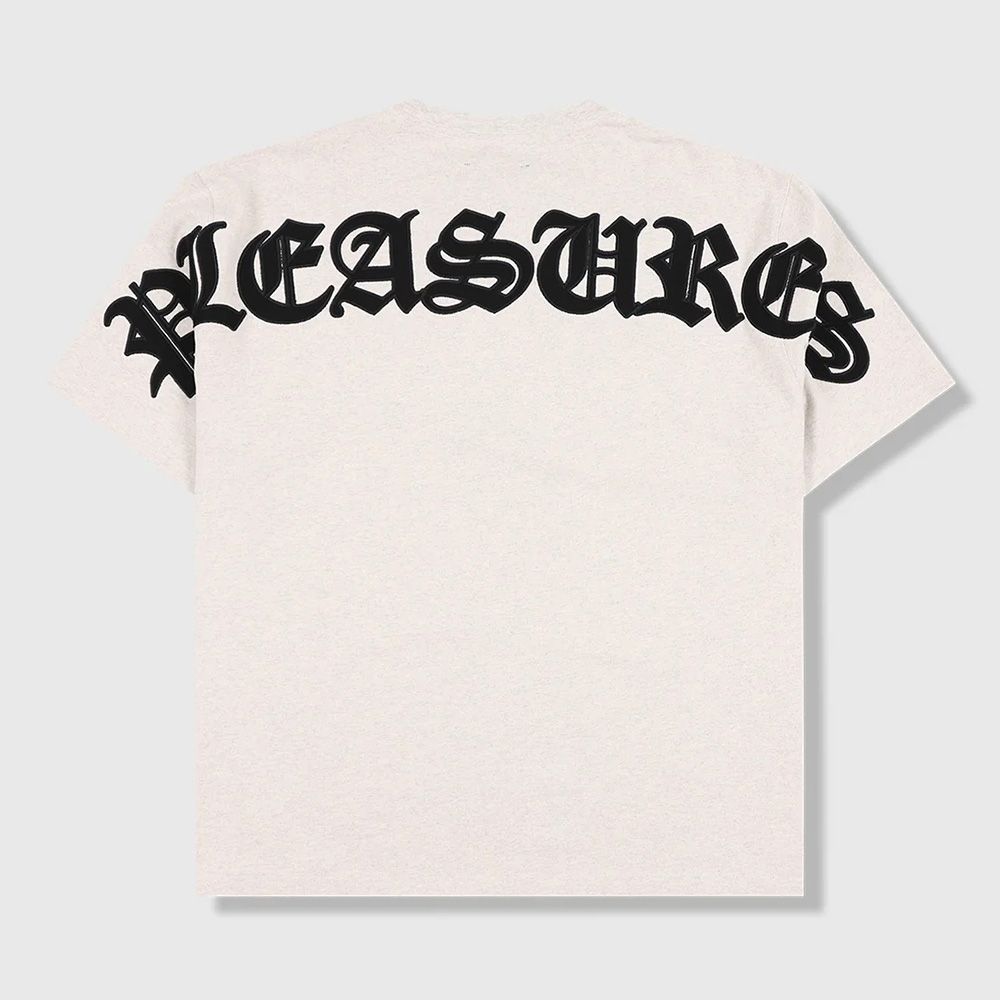PLEASURES Neural Applique T-Shirt, t-shirt in jersey di cotone pesante con fit rilassato. Logo "PLEASURES" in carattere gotico nero applicato ad arco — piccolo sul petto, oversize sulla schiena che si estende fino alle maniche.