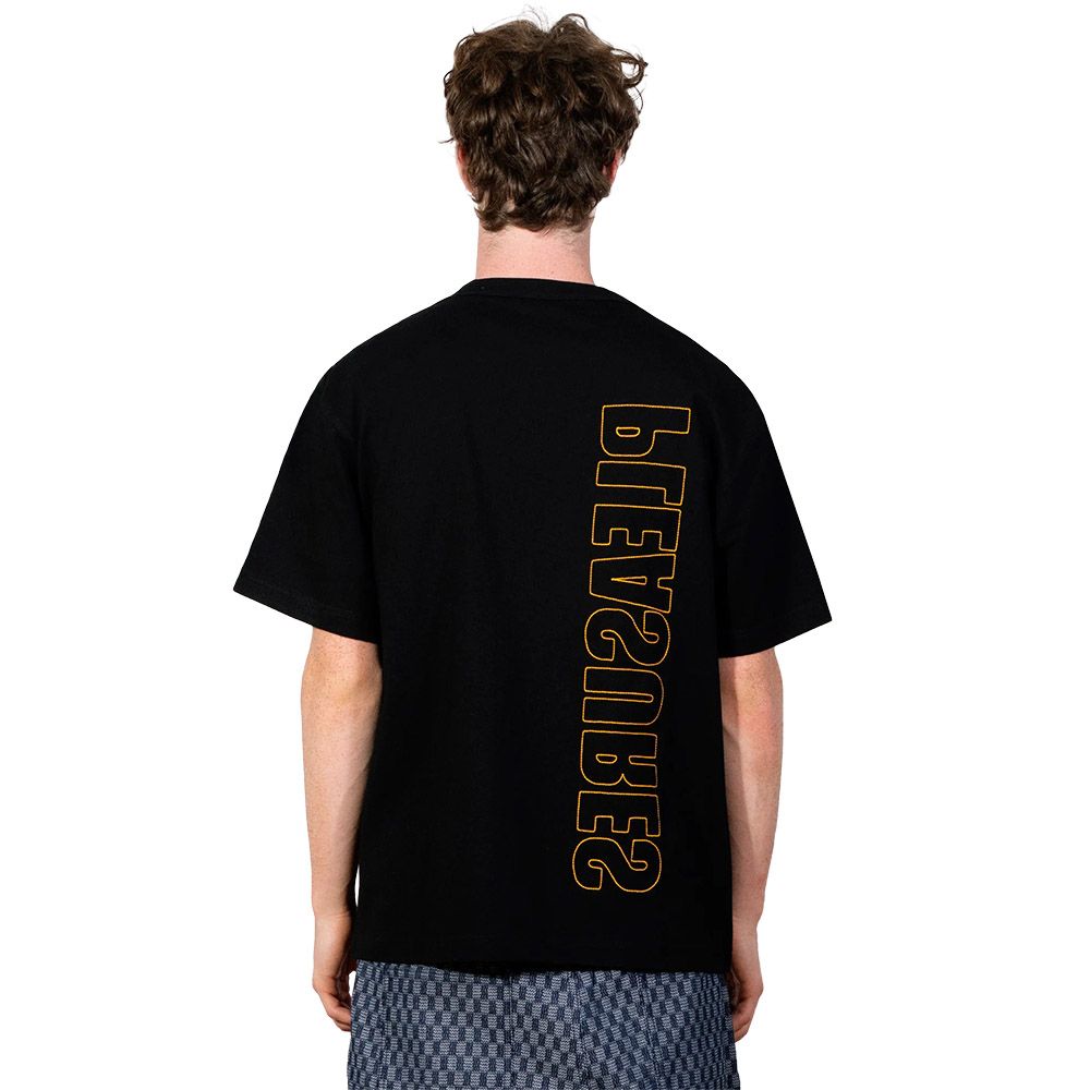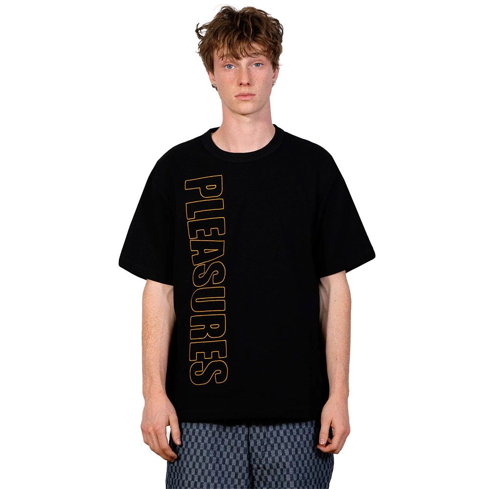 PLEASURES Outline Heavyweight T-Shirt, maglietta in jersey di cotone 26 doubles. Il tessuto ha una grammatura importante che dà struttura al corpo senza rigidità. Il logo PLEASURES in versione outline corre verticale su fronte e retro, ricamato. Il fit è relaxed con spalle scese: chi è abituato a tagli più asciutti dovrebbe considerare una taglia in meno. Il ricamo mantiene definizione e rilievo anche dopo lavaggi ripetuti.