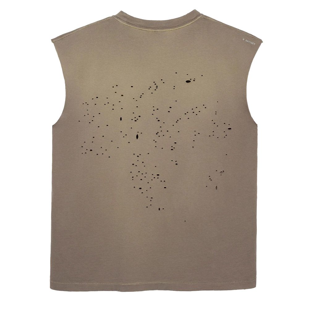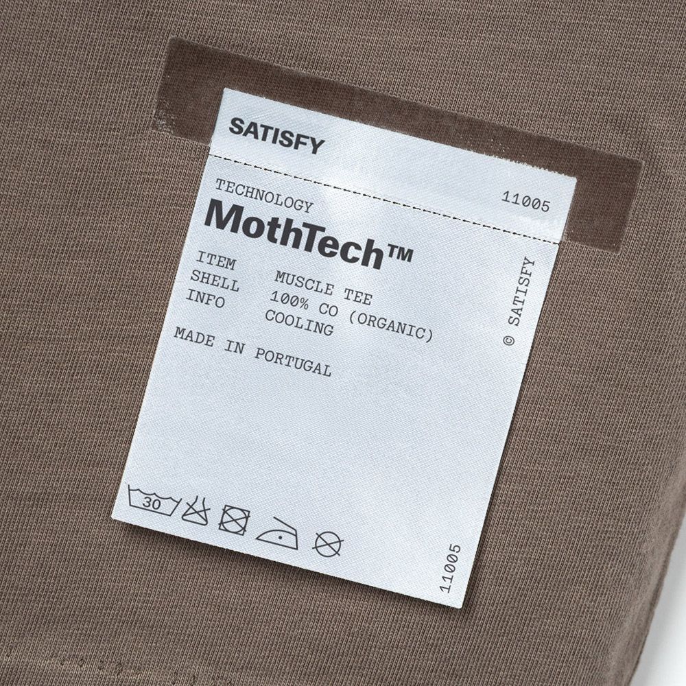 Satisfy MothTech™ Muscle Tee, canotta in cotone organico pettinato ispirata al tessuto consumato dal tempo. 148 grammi. Fori laser-cut e aperti a mano per creare flusso d'aria dove il corpo ne ha bisogno durante la corsa. Logo SATISFY in puffy ink sul petto. Logo stealth-riflettente per la visibilità in notturna. Etichetta di lavaggio esterna e rimovibile. Produzione etica in Portogallo.