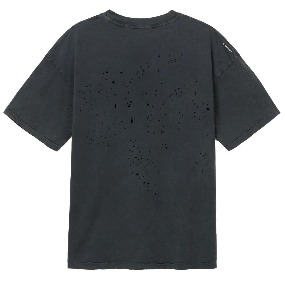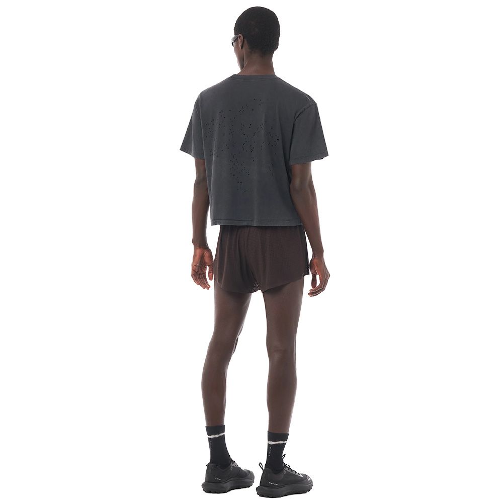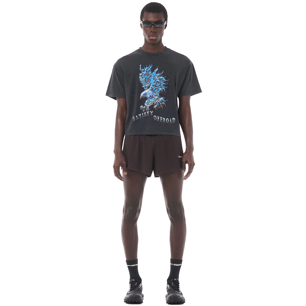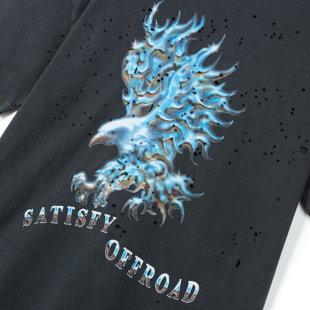 SATISFY MothTech™ T-Shirt, t-shirt in cotone organico pettinato da 175 grammi con fori laser per la ventilazione. Ogni foro è tagliato al laser e aperto a mano, seguendo una mappa progettata per il movimento e la dispersione del calore. Il tessuto ha un aspetto vissuto, come se fosse stato in dialogo col tempo. Logo SATISFY riflettente stealth che cattura la luce al buio, stampa "Off Road" ispirata agli animali a sangue freddo che mutano per adattarsi. Etichetta di manutenzione completamente rimovibile, niente all'interno che non dovrebbe esserci. Prodotta in Portogallo.