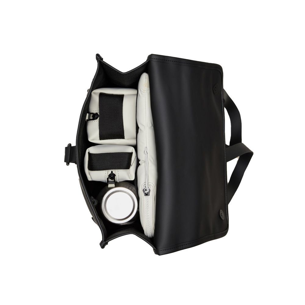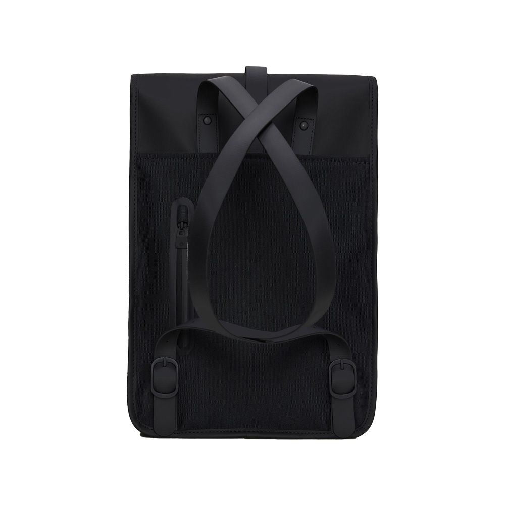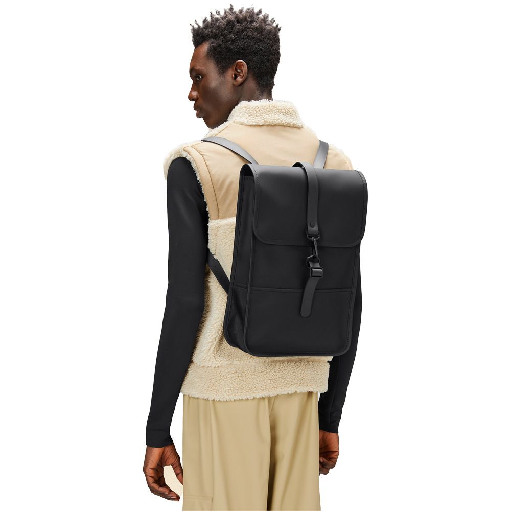 Rains Backpack Mini, versione più compatta e minimalista del classico modello Backpack. Contraddistinto da una patta sporgente e una cinghia centrale con chiusura a moschettone, questo zainetto unisce funzionalità ed estetica. Presenta una tasca interna per computer portatile, uno scomparto principale capiente e una pratica tasca nascosta sul retro, ideale per il telefono. Realizzato con il tessuto in PU impermeabile firmato Rains, il Backpack Mini offre resistenza e una gradevole sensazione al tatto. Black.