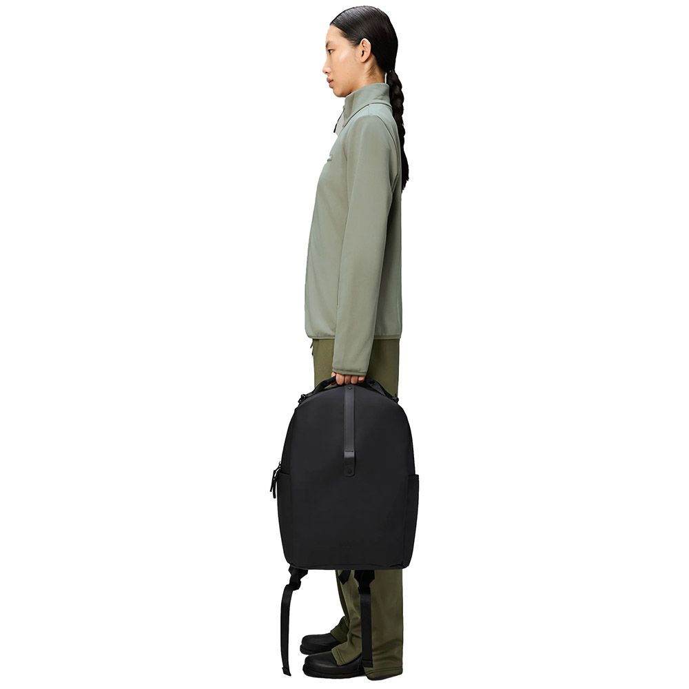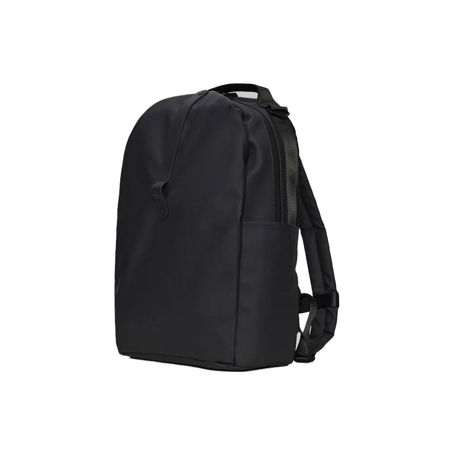 Rains Clip Front Backpack, zaino waterproof da 21 litri progettato per uso urbano e pendolarismo quotidiano. Realizzato in tessuto TPU impermeabile con colonna d'acqua 8000 mm, garantisce protezione totale del contenuto. L'apertura principale con cerniera arrotondata offre accesso completo, mentre la chiusura frontale con moschettone nasconde una tasca esterna aggiuntiva. Lo scomparto interno include tasca imbottita per laptop 16", tasca mesh sospesa, tasca con zip e anello portachiavi. Due tasche laterali esterne per bottiglie, pannello posteriore in mesh imbottito e spallacci regolabili con fascia toracica assicurano comfort durante il trasporto. Dimensioni 44x16x30 cm.